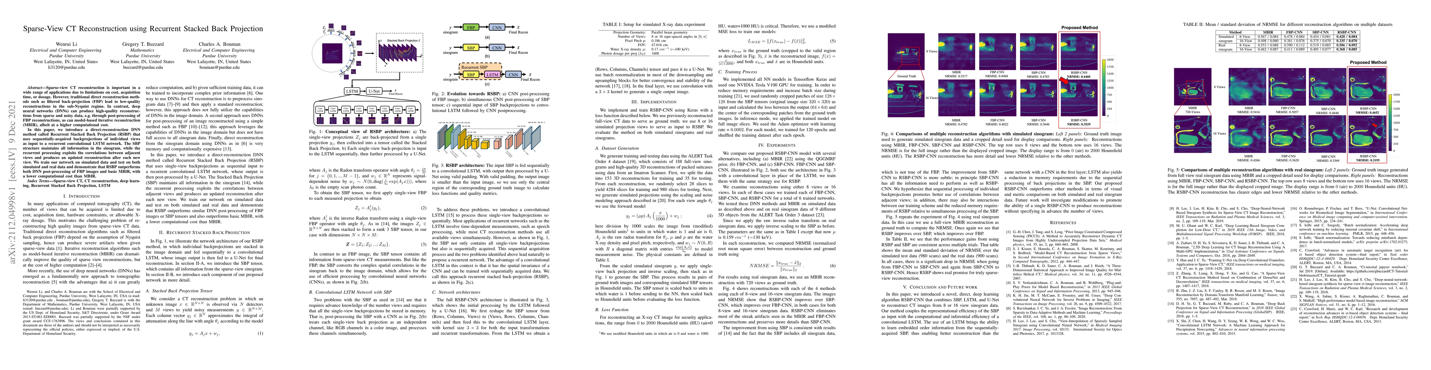 The paper introduces Recurrent Stacked Back Projection (RSBP), a direct-reconstruction DNN method that uses sequentially-acquired backprojections of individual views as input to a recurrent convolutional LSTM network, exploiting correlations between adjacent views for improved CT image reconstruction from sparse and noisy data.