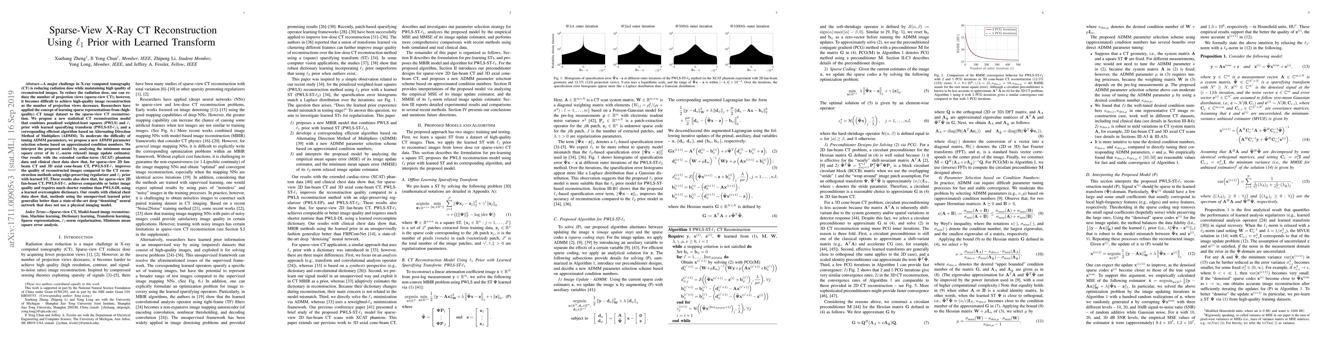 A major challenge in X-ray computed tomography (CT) is reducing radiation dose while maintaining high quality of reconstructed images. To reduce the radiation dose, one can reduce the number of projection views (sparse-view CT); however, it becomes difficult to achieve high-quality image reconstruction as the number of projection views decreases. Researchers have applied the concept of learning sparse representations from (high-quality) CT image dataset to the sparse-view CT reconstruction. We propose a new statistical CT reconstruction model that combines penalized weighted-least squares (PWLS) and $\ell_1$ prior with learned sparsifying transform (PWLS-ST-$\ell_1$), and a corresponding efficient algorithm based on Alternating Direction Method of Multipliers (ADMM). To moderate the difficulty of tuning ADMM parameters, we propose a new ADMM parameter selection scheme based on approximated condition numbers. We interpret the proposed model by analyzing the minimum mean square error of its ($\ell_2$-norm relaxed) image update estimator. Our results with the extended cardiac-torso (XCAT) phantom data and clinical chest data show that, for sparse-view 2D fan-beam CT and 3D axial cone-beam CT, PWLS-ST-$\ell_1$ improves the quality of reconstructed images compared to the CT reconstruction methods using edge-preserving regularizer and $\ell_2$ prior with learned ST. These results also show that, for sparse-view 2D fan-beam CT, PWLS-ST-$\ell_1$ achieves comparable or better image quality and requires much shorter runtime than PWLS-DL using a learned overcomplete dictionary. Our results with clinical chest data show that, methods using the unsupervised learned prior generalize better than a state-of-the-art deep "denoising" neural network that does not use a physical imaging model.