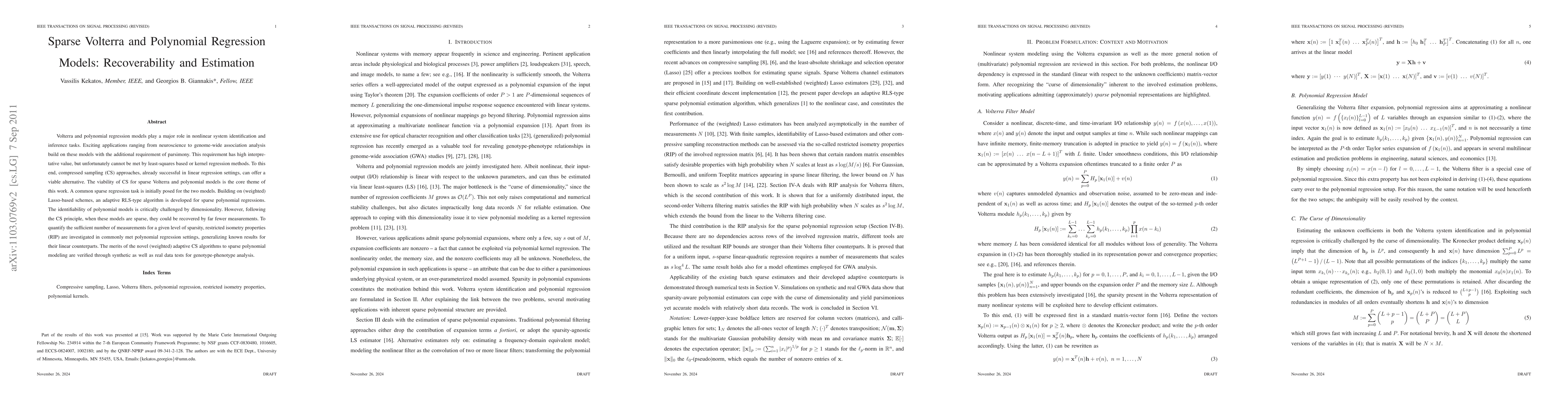 This paper explores the use of compressed sampling (CS) approaches for sparse Volterra and polynomial regression models, which are essential for interpretable nonlinear system identification. It develops an adaptive RLS-type algorithm for sparse polynomial regressions and investigates the restricted isometry properties (RIP) to determine the sufficient number of measurements needed for recovery, demonstrating the effectiveness through synthetic and real data tests.