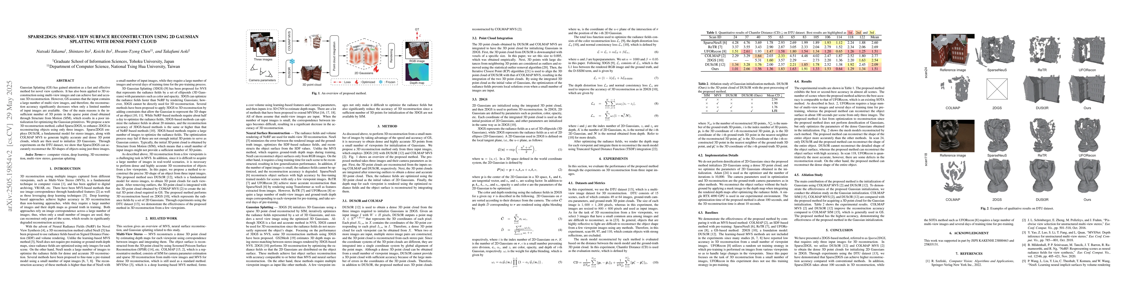 Sparse2DGS introduces a novel integration of DUSt3R and COLMAP MVS for generating high-quality 3D point clouds from sparse multi-view images, improving the initialization process for 2D Gaussian Splatting.