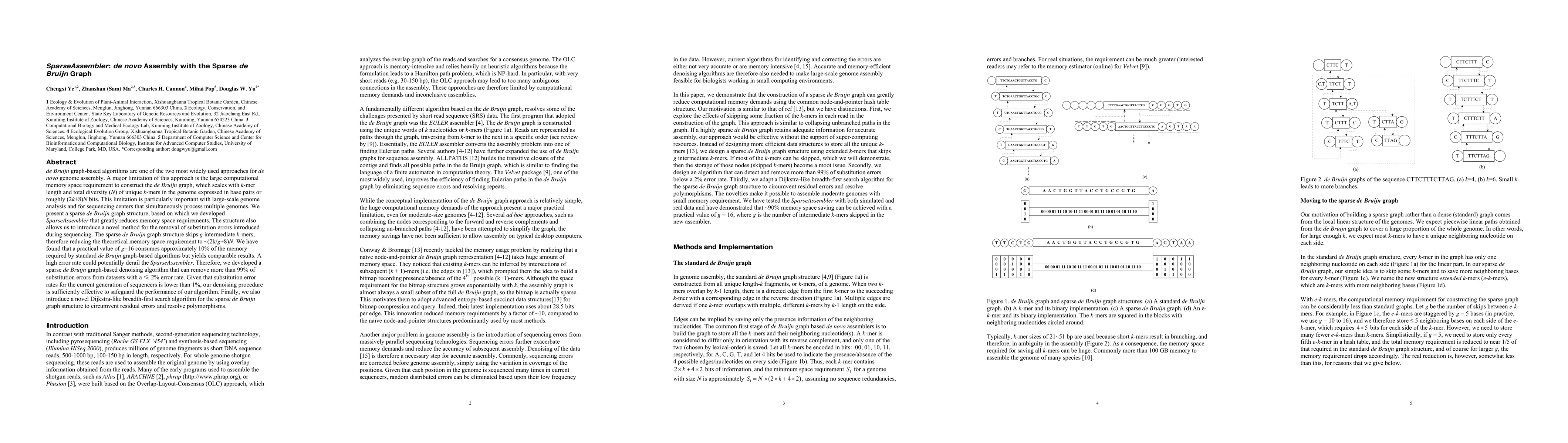 SparseAssembler introduces a sparse de Bruijn graph structure to significantly reduce memory requirements for de novo genome assembly, achieving approximately 10% of the memory used by standard methods while maintaining comparable results. It also includes a denoising algorithm to remove substitution errors, ensuring effective performance for current sequencing technologies.