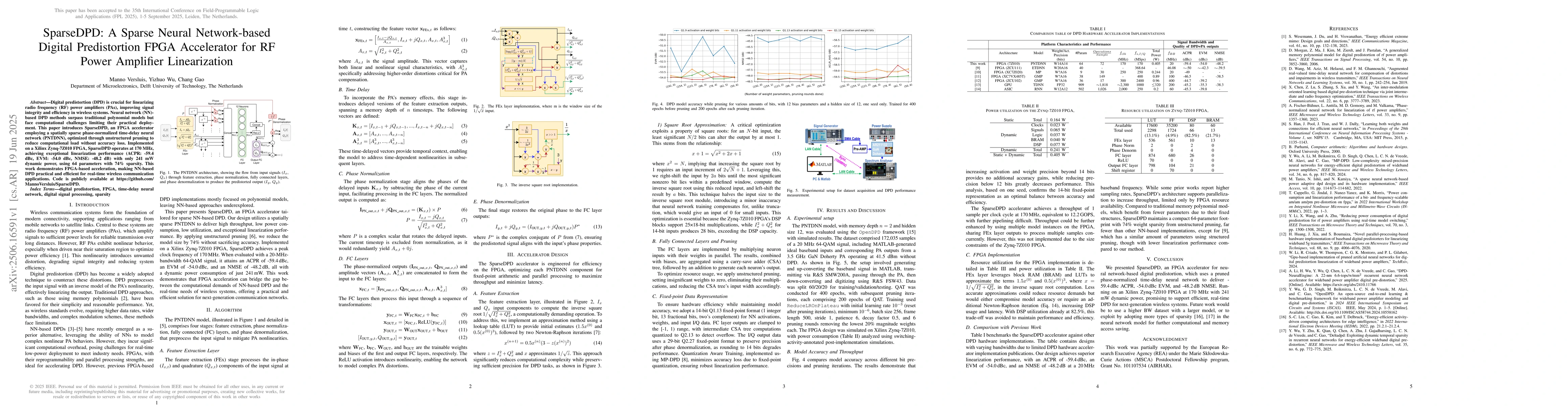 Digital predistortion (DPD) is crucial for linearizing radio frequency (RF) power amplifiers (PAs), improving signal integrity and efficiency in wireless systems. Neural network (NN)-based DPD methods surpass traditional polynomial models but face computational challenges limiting their practical deployment. This paper introduces SparseDPD, an FPGA accelerator employing a spatially sparse phase-normalized time-delay neural network (PNTDNN), optimized through unstructured pruning to reduce computational load without accuracy loss. Implemented on a Xilinx Zynq-7Z010 FPGA, SparseDPD operates at 170 MHz, achieving exceptional linearization performance (ACPR: -59.4 dBc, EVM: -54.0 dBc, NMSE: -48.2 dB) with only 241 mW dynamic power, using 64 parameters with 74% sparsity. This work demonstrates FPGA-based acceleration, making NN-based DPD practical and efficient for real-time wireless communication applications. Code is publicly available at https://github.com/MannoVersluis/SparseDPD.
