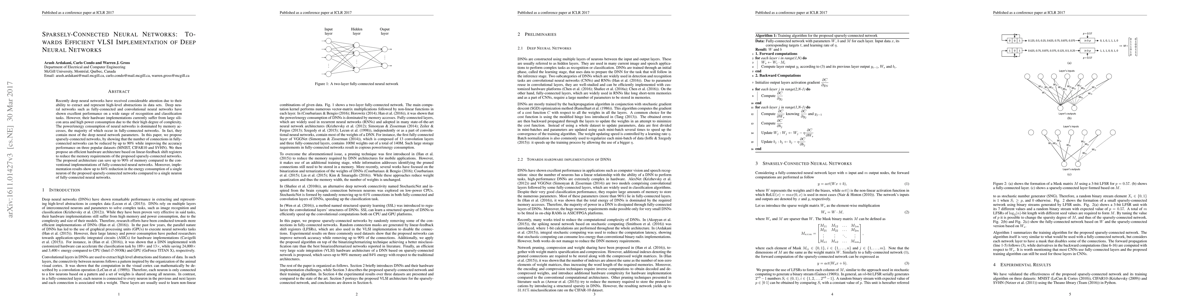 Recently deep neural networks have received considerable attention due to their ability to extract and represent high-level abstractions in data sets. Deep neural networks such as fully-connected and convolutional neural networks have shown excellent performance on a wide range of recognition and classification tasks. However, their hardware implementations currently suffer from large silicon area and high power consumption due to the their high degree of complexity. The power/energy consumption of neural networks is dominated by memory accesses, the majority of which occur in fully-connected networks. In fact, they contain most of the deep neural network parameters. In this paper, we propose sparsely-connected networks, by showing that the number of connections in fully-connected networks can be reduced by up to 90% while improving the accuracy performance on three popular datasets (MNIST, CIFAR10 and SVHN). We then propose an efficient hardware architecture based on linear-feedback shift registers to reduce the memory requirements of the proposed sparsely-connected networks. The proposed architecture can save up to 90% of memory compared to the conventional implementations of fully-connected neural networks. Moreover, implementation results show up to 84% reduction in the energy consumption of a single neuron of the proposed sparsely-connected networks compared to a single neuron of fully-connected neural networks.