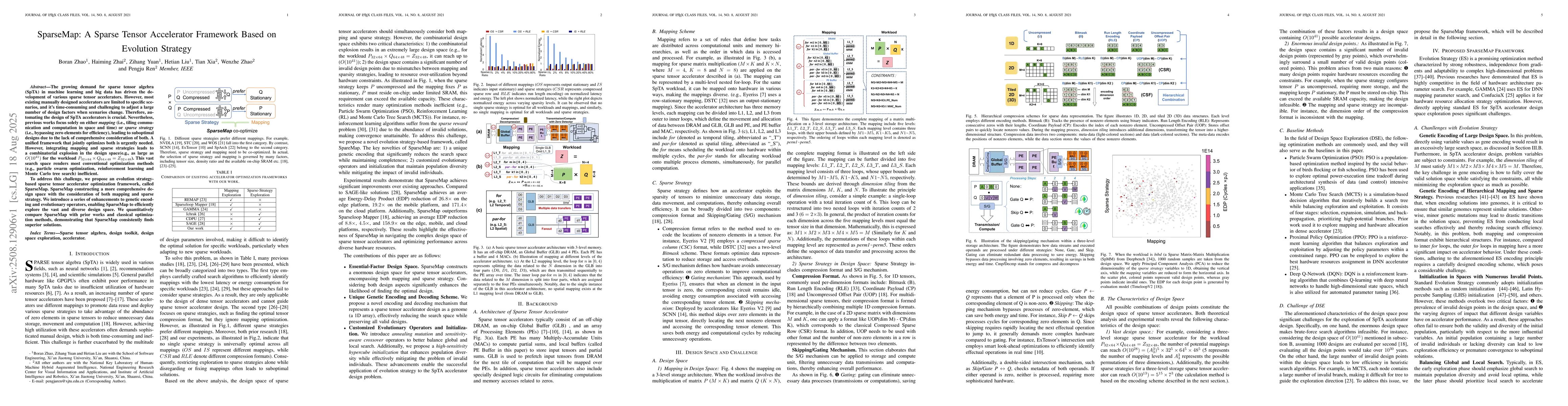 The growing demand for sparse tensor algebra (SpTA) in machine learning and big data has driven the development of various sparse tensor accelerators. However, most existing manually designed accelerators are limited to specific scenarios, and it's time-consuming and challenging to adjust a large number of design factors when scenarios change. Therefore, automating the design of SpTA accelerators is crucial. Nevertheless, previous works focus solely on either mapping (i.e., tiling communication and computation in space and time) or sparse strategy (i.e., bypassing zero elements for efficiency), leading to suboptimal designs due to the lack of comprehensive consideration of both. A unified framework that jointly optimizes both is urgently needed. However, integrating mapping and sparse strategies leads to a combinatorial explosion in the design space(e.g., as large as $O(10^{41})$ for the workload $P_{32 \times 64} \times Q_{64 \times 48} = Z_{32 \times 48}$). This vast search space renders most conventional optimization methods (e.g., particle swarm optimization, reinforcement learning and Monte Carlo tree search) inefficient. To address this challenge, we propose an evolution strategy-based sparse tensor accelerator optimization framework, called SparseMap. SparseMap constructing a more comprehensive design space with the consideration of both mapping and sparse strategy. We introduce a series of enhancements to genetic encoding and evolutionary operators, enabling SparseMap to efficiently explore the vast and diverse design space. We quantitatively compare SparseMap with prior works and classical optimization methods, demonstrating that SparseMap consistently finds superior solutions.