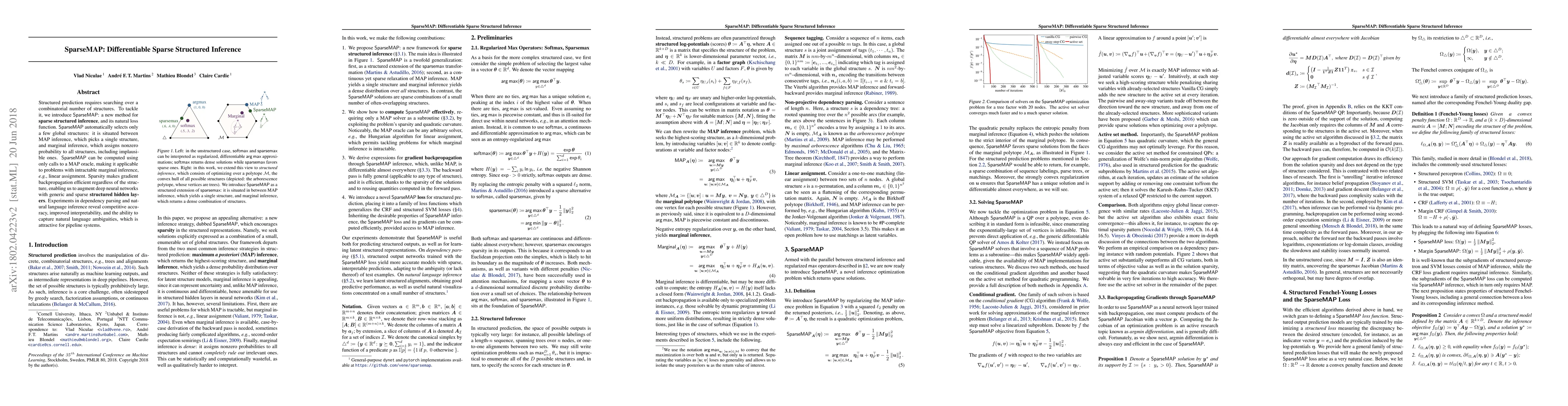Structured prediction requires searching over a combinatorial number of structures. To tackle it, we introduce SparseMAP: a new method for sparse structured inference, and its natural loss function. SparseMAP automatically selects only a few global structures: it is situated between MAP inference, which picks a single structure, and marginal inference, which assigns probability mass to all structures, including implausible ones. Importantly, SparseMAP can be computed using only calls to a MAP oracle, making it applicable to problems with intractable marginal inference, e.g., linear assignment. Sparsity makes gradient backpropagation efficient regardless of the structure, enabling us to augment deep neural networks with generic and sparse structured hidden layers. Experiments in dependency parsing and natural language inference reveal competitive accuracy, improved interpretability, and the ability to capture natural language ambiguities, which is attractive for pipeline systems.