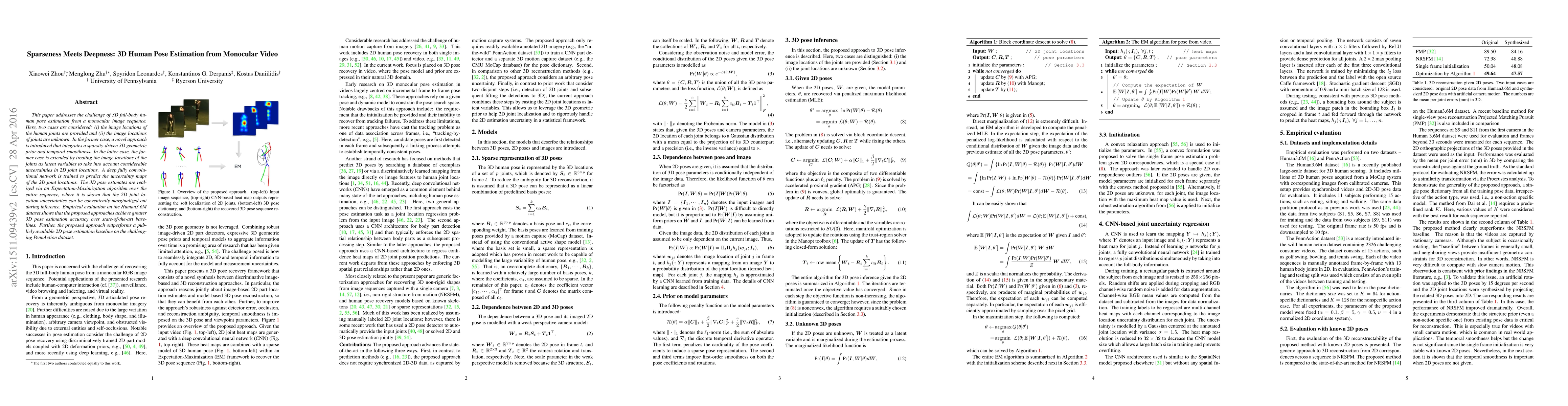 This paper addresses the challenge of 3D full-body human pose estimation from a monocular image sequence. Here, two cases are considered: (i) the image locations of the human joints are provided and (ii) the image locations of joints are unknown. In the former case, a novel approach is introduced that integrates a sparsity-driven 3D geometric prior and temporal smoothness. In the latter case, the former case is extended by treating the image locations of the joints as latent variables. A deep fully convolutional network is trained to predict the uncertainty maps of the 2D joint locations. The 3D pose estimates are realized via an Expectation-Maximization algorithm over the entire sequence, where it is shown that the 2D joint location uncertainties can be conveniently marginalized out during inference. Empirical evaluation on the Human3.6M dataset shows that the proposed approaches achieve greater 3D pose estimation accuracy over state-of-the-art baselines. Further, the proposed approach outperforms a publicly available 2D pose estimation baseline on the challenging PennAction dataset.