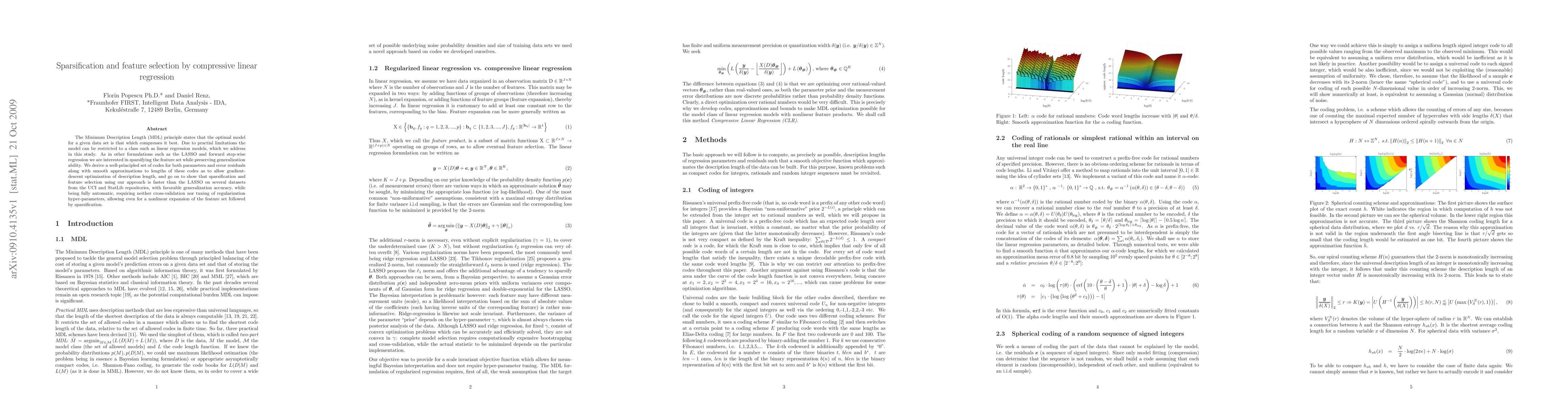 The Minimum Description Length (MDL) principle states that the optimal model for a given data set is that which compresses it best. Due to practial limitations the model can be restricted to a class such as linear regression models, which we address in this study. As in other formulations such as the LASSO and forward step-wise regression we are interested in sparsifying the feature set while preserving generalization ability. We derive a well-principled set of codes for both parameters and error residuals along with smooth approximations to lengths of these codes as to allow gradient descent optimization of description length, and go on to show that sparsification and feature selection using our approach is faster than the LASSO on several datasets from the UCI and StatLib repositories, with favorable generalization accuracy, while being fully automatic, requiring neither cross-validation nor tuning of regularization hyper-parameters, allowing even for a nonlinear expansion of the feature set followed by sparsification.