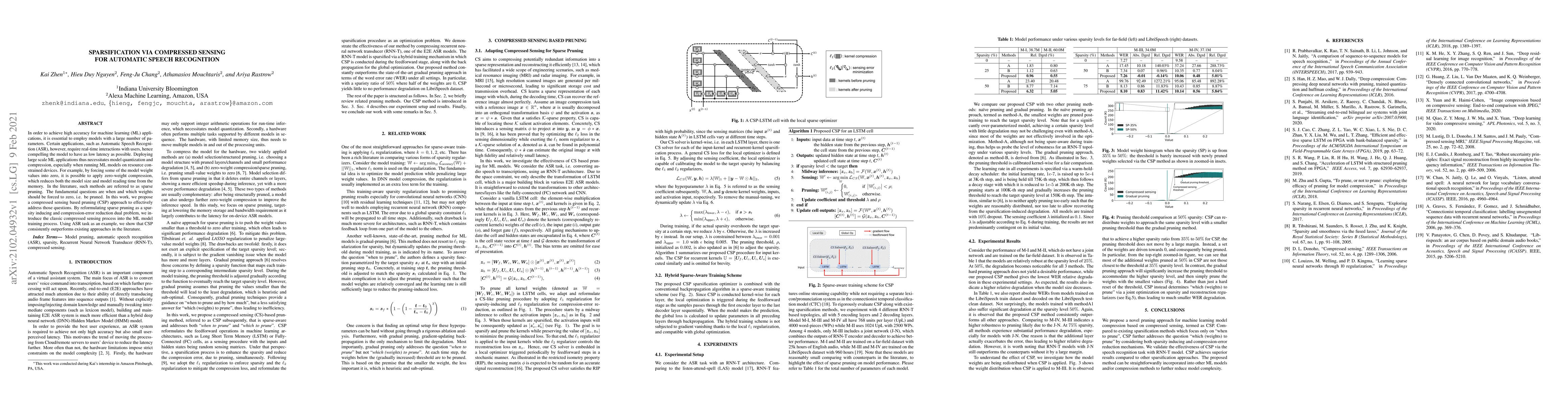 In order to achieve high accuracy for machine learning (ML) applications, it is essential to employ models with a large number of parameters. Certain applications, such as Automatic Speech Recognition (ASR), however, require real-time interactions with users, hence compelling the model to have as low latency as possible. Deploying large scale ML applications thus necessitates model quantization and compression, especially when running ML models on resource constrained devices. For example, by forcing some of the model weight values into zero, it is possible to apply zero-weight compression, which reduces both the model size and model reading time from the memory. In the literature, such methods are referred to as sparse pruning. The fundamental questions are when and which weights should be forced to zero, i.e. be pruned. In this work, we propose a compressed sensing based pruning (CSP) approach to effectively address those questions. By reformulating sparse pruning as a sparsity inducing and compression-error reduction dual problem, we introduce the classic compressed sensing process into the ML model training process. Using ASR task as an example, we show that CSP consistently outperforms existing approaches in the literature.