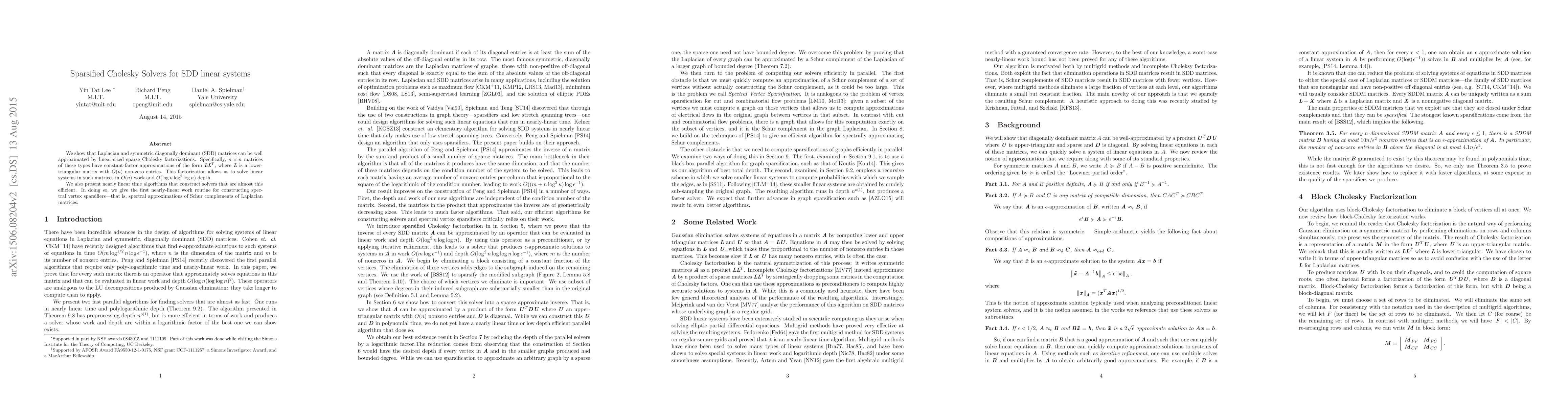 This paper presents efficient sparse Cholesky solvers for SDD linear systems, demonstrating that Laplacian and SDD matrices can be approximated by linear-sized sparse Cholesky factorizations. It introduces nearly linear time algorithms for constructing these solvers, achieving $O(n)$ work and $O(\log{n}\log^2\log{n})$ depth for solving linear systems.