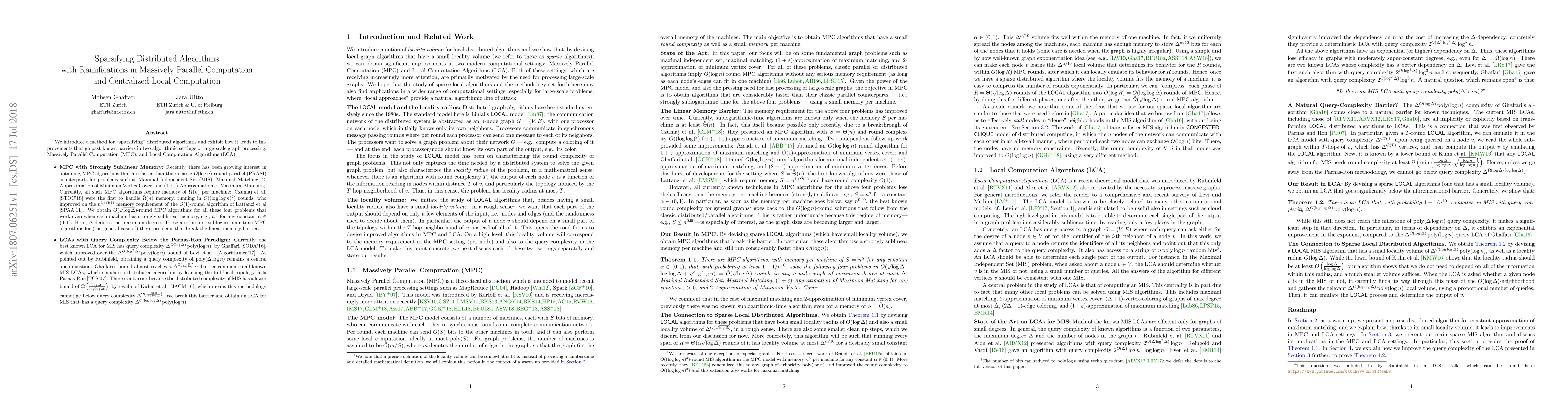 We introduce a method for sparsifying distributed algorithms and exhibit how it leads to improvements that go past known barriers in two algorithmic settings of large-scale graph processing: Massively Parallel Computation (MPC), and Local Computation Algorithms (LCA). - MPC with Strongly Sublinear Memory: Recently, there has been growing interest in obtaining MPC algorithms that are faster than their classic $O(\log n)$-round parallel counterparts for problems such as MIS, Maximal Matching, 2-Approximation of Minimum Vertex Cover, and $(1+\epsilon)$-Approximation of Maximum Matching. Currently, all such MPC algorithms require $\tilde{\Omega}(n)$ memory per machine. Czumaj et al. [STOC'18] were the first to handle $\tilde{\Omega}(n)$ memory, running in $O((\log\log n)^2)$ rounds. We obtain $\tilde{O}(\sqrt{\log \Delta})$-round MPC algorithms for all these four problems that work even when each machine has memory $n^{\alpha}$ for any constant $\alpha\in (0, 1)$. Here, $\Delta$ denotes the maximum degree. These are the first sublogarithmic-time algorithms for these problems that break the linear memory barrier. - LCAs with Query Complexity Below the Parnas-Ron Paradigm: Currently, the best known LCA for MIS has query complexity $\Delta^{O(\log \Delta)} poly(\log n)$, by Ghaffari [SODA'16]. As pointed out by Rubinfeld, obtaining a query complexity of $poly(\Delta\log n)$ remains a central open question. Ghaffari's bound almost reaches a $\Delta^{\Omega\left(\frac{\log \Delta}{\log\log \Delta}\right)}$ barrier common to all known MIS LCAs, which simulate distributed algorithms by learning the local topology, \`{a} la Parnas-Ron [TCS'07]. This barrier follows from the $\Omega(\frac{\log \Delta}{\log\log \Delta})$ distributed lower bound of Kuhn, et al. [JACM'16]. We break this barrier and obtain an MIS LCA with query complexity $\Delta^{O(\log\log \Delta)} poly(\log n)$.