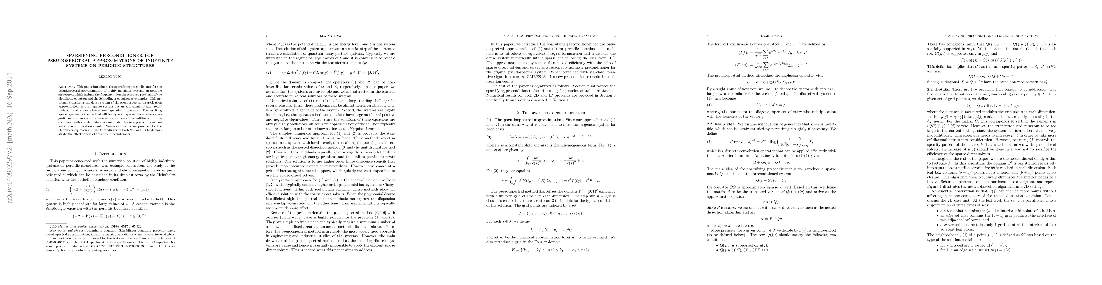 This paper proposes a sparsifying preconditioner for pseudospectral approximations of indefinite systems on periodic structures, transforming dense systems into sparse ones via an integral reformulation and a sparsifying operator. The resulting sparse system enables efficient solution with sparse linear algebra algorithms, significantly reducing iteration counts when used with iterative methods, as demonstrated by numerical results for the Helmholtz and Schrödinger equations in 2D and 3D.