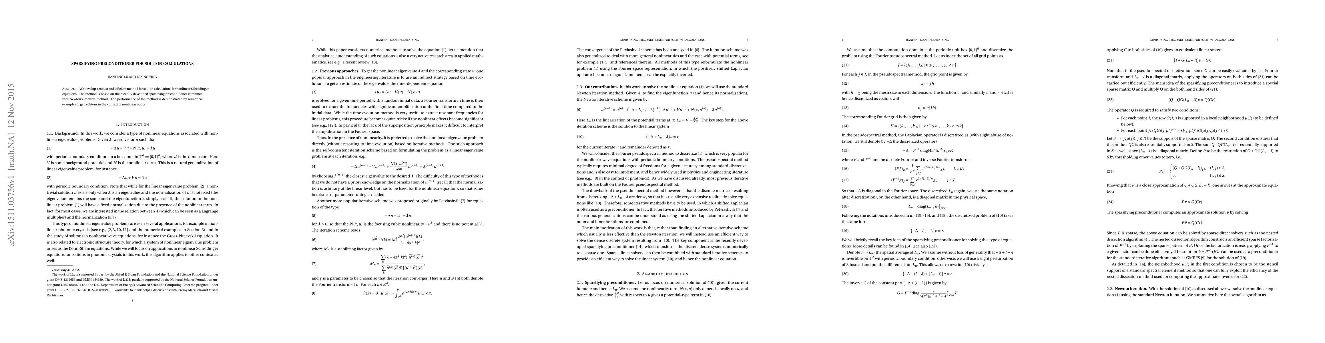 This paper introduces a robust and efficient method for soliton calculations in nonlinear Schrödinger equations using a sparsifying preconditioner and Newton's iterative method. Numerical examples demonstrate the method's effectiveness in modeling gap solitons in nonlinear optics.