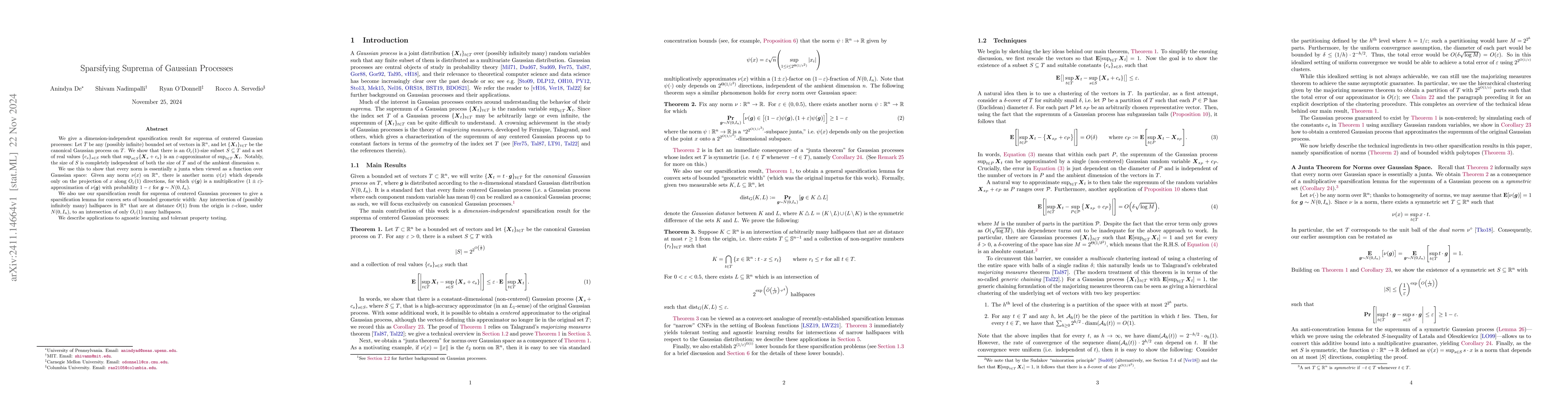 This paper presents a dimension-independent sparsification result for suprema of centered Gaussian processes, showing that a small subset approximates the supremum over a large set. It demonstrates that norms can be approximated by functions dependent on only a few directions, and extends this to provide a sparsification lemma for convex sets. Applications include agnostic learning and tolerant property testing.