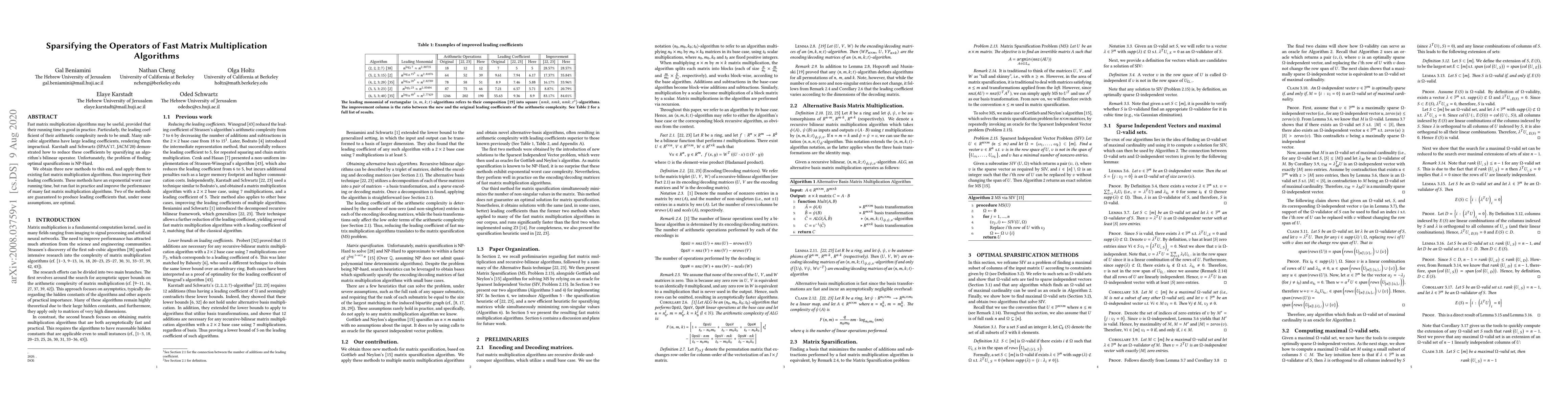 This paper proposes three new methods for sparsifying the operators of fast matrix multiplication algorithms to reduce their leading coefficients, thereby enhancing practical performance. Despite an exponential worst-case running time, these methods effectively improve many existing algorithms in practice, with two ensuring near-optimal results under certain assumptions.