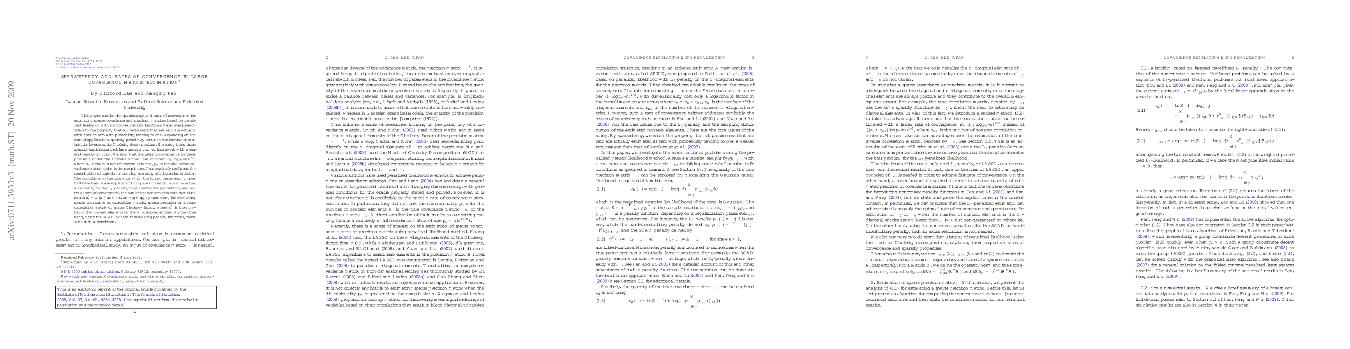 This paper investigates the sparsistency and convergence rates for estimating sparse covariance matrices using penalized likelihood with nonconvex penalty functions. It demonstrates that convergence rates under the Frobenius norm are of order $(s_n\log p_n/n)^{1/2}$, highlighting the logarithmic impact of high-dimensionality. The study specifies conditions for tuning parameter $\lambda_n$ to ensure optimal convergence, with different requirements for $L_1$, SCAD, and hard-thresholding penalties.