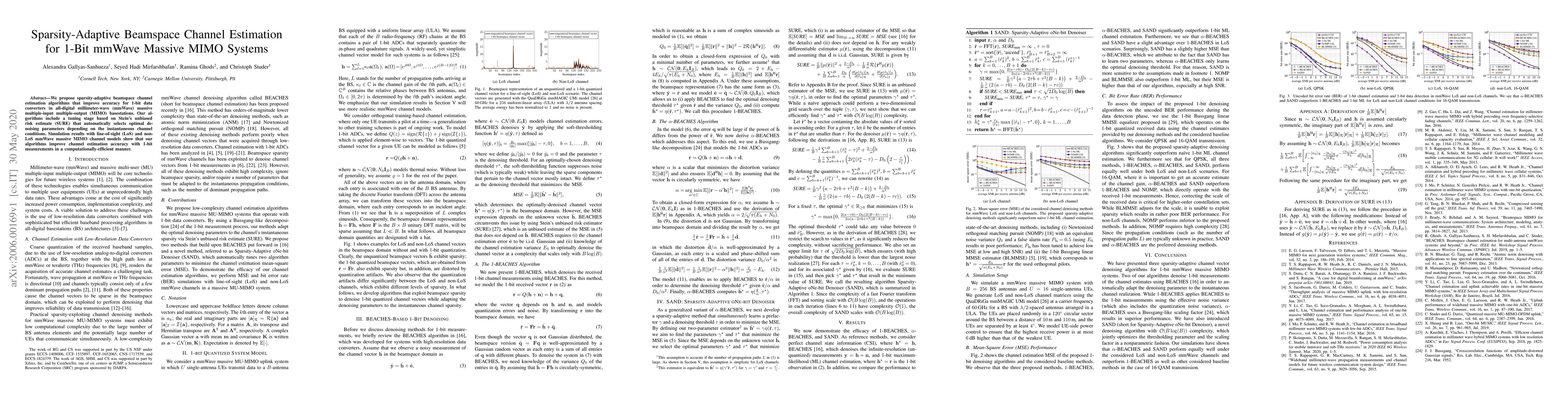 We propose sparsity-adaptive beamspace channel estimation algorithms that improve accuracy for 1-bit data converters in all-digital millimeter-wave (mmWave) massive multiple-input multiple-output (MIMO) basestations. Our algorithms include a tuning stage based on Stein's unbiased risk estimate (SURE) that automatically selects optimal denoising parameters depending on the instantaneous channel conditions. Simulation results with line-of-sight (LoS) and non-LoS mmWave massive MIMO channel models show that our algorithms improve channel estimation accuracy with 1-bit measurements in a computationally-efficient manner.
