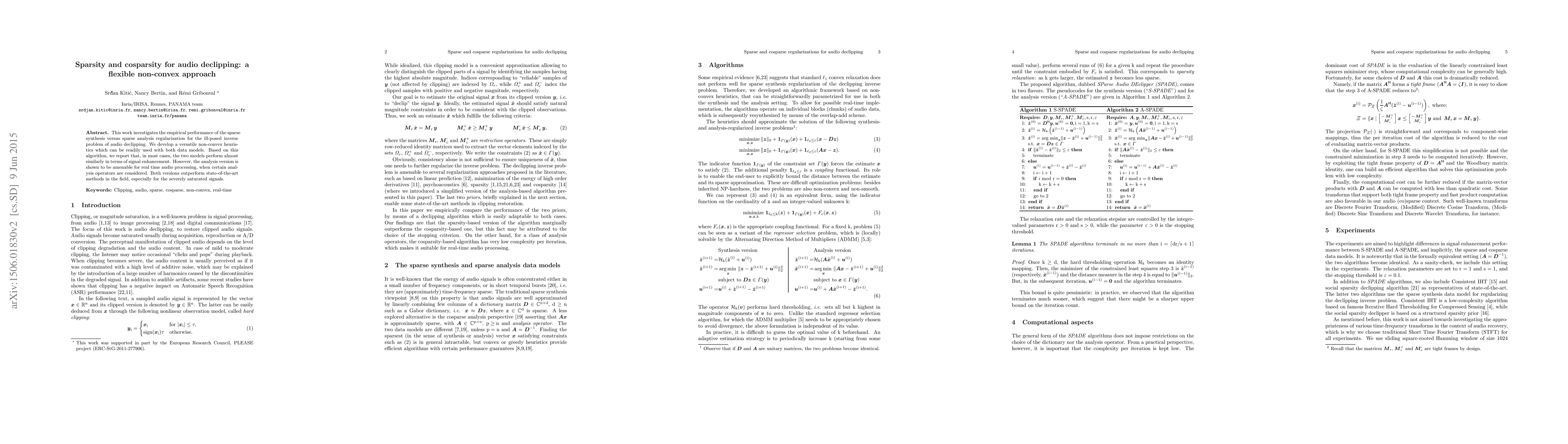 This research paper compares two methods for audio declipping: sparse synthesis and sparse analysis regularization. Both approaches outperform state-of-the-art methods in enhancing severely saturated signals.