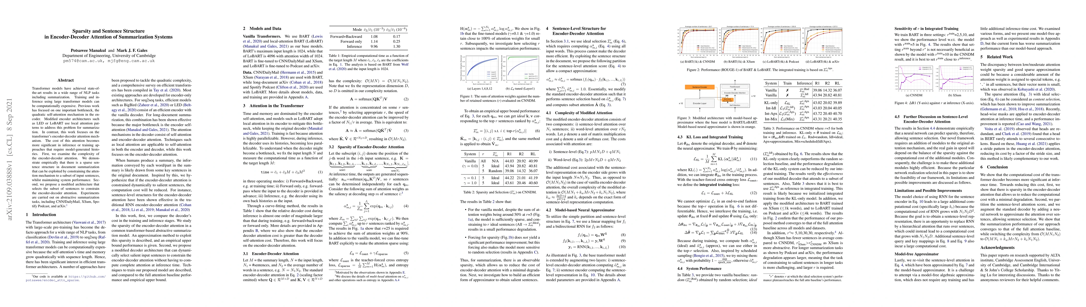 This paper explores the sparsity in sentence structure within document summarization to optimize the encoder-decoder attention in transformer models. It proposes a modified architecture that selectively constrains attention to a subset of sentences, achieving comparable performance while reducing computational costs.