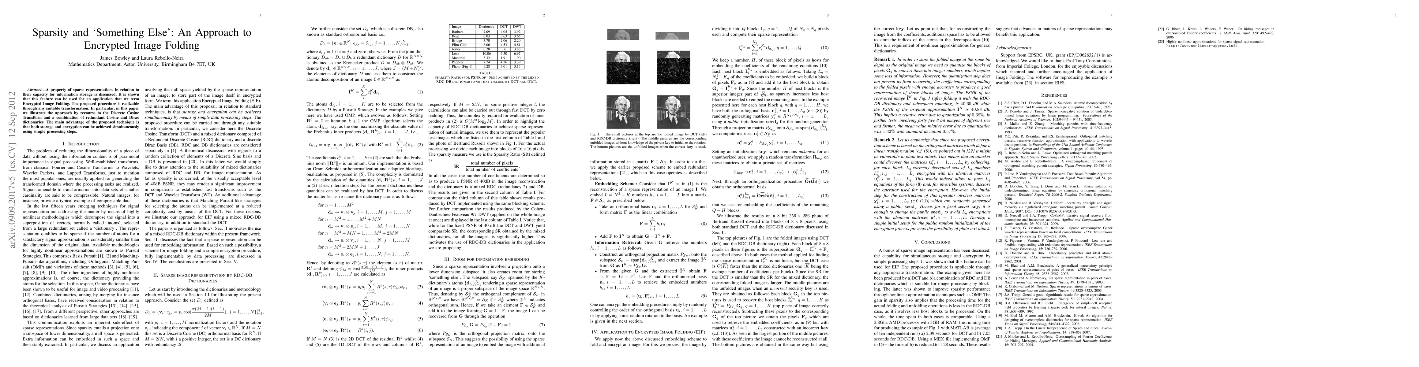 A property of sparse representations in relation to their capacity for information storage is discussed. It is shown that this feature can be used for an application that we term Encrypted Image Folding. The proposed procedure is realizable through any suitable transformation. In particular, in this paper we illustrate the approach by recourse to the Discrete Cosine Transform and a combination of redundant Cosine and Dirac dictionaries. The main advantage of the proposed technique is that both storage and encryption can be achieved simultaneously using simple processing steps.