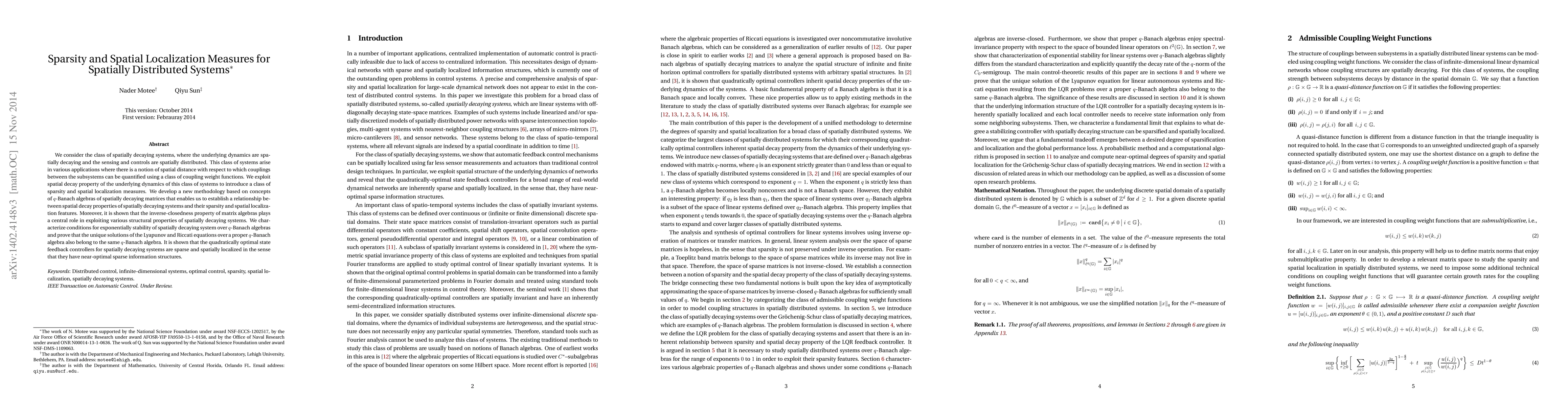 We consider the class of spatially decaying systems, where the underlying dynamics are spatially decaying and the sensing and controls are spatially distributed. This class of systems arise in various applications where there is a notion of spatial distance with respect to which couplings between the subsystems can be quantified using a class of coupling weight functions. We exploit spatial decay property of the underlying dynamics of the system to introduce a class of sparsity and spatial localization measures for spatially distributed systems. We develop a new methodology based on concepts of $q$-Banach algebras of spatially decaying operators that enable us to establish a relationship between spatial decay properties of spatially decaying systems and their sparsity and spatial localization features. Moreover, it is shown that the inverse-closedness property of operator algebras plays a central role in exploiting various structural properties of spatially decaying systems. We characterize conditions for exponentially stability of spatially decaying system over $q$-Banach algebras and prove that the unique solutions of the Lyapunov and Riccati equations over a proper $q$-Banach algebra also belong to the same $q$-Banach algebra. It is shown that the quadratically optimal state feedback controllers for spatially decaying systems are sparse and spatially localized in the sense that they have near-optimal sparse information structures.