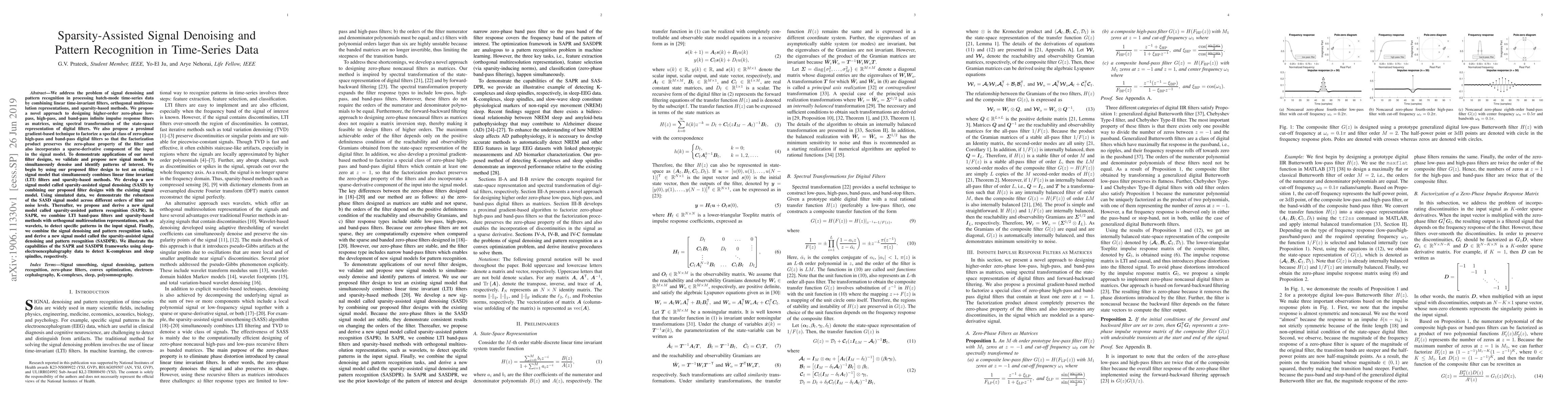 We address the problem of signal denoising and pattern recognition in processing batch-mode time-series data by combining linear time-invariant filters, orthogonal multiresolution representations, and sparsity-based methods. We propose a novel approach to designing higher-order zero-phase low-pass, high-pass, and band-pass infinite impulse response filters as matrices, using spectral transformation of the state-space representation of digital filters. We also propose a proximal gradient-based technique to factorize a special class of zero-phase high-pass and band-pass digital filters so that the factorization product preserves the zero-phase property of the filter and also incorporates a sparse-derivative component of the input in the signal model. To demonstrate applications of our novel filter designs, we validate and propose new signal models to simultaneously denoise and identify patterns of interest. We begin by using our proposed filter design to test an existing signal model that simultaneously combines linear time invariant (LTI) filters and sparsity-based methods. We develop a new signal model called sparsity-assisted signal denoising (SASD) by combining our proposed filter designs with the existing signal model. Thereafter, we propose and derive a new signal model called sparsity-assisted pattern recognition (SAPR). In SAPR, we combine LTI band-pass filters and sparsity-based methods with orthogonal multiresolution representations, such as wavelets, to detect specific patterns in the input signal. Finally, we combine the signal denoising and pattern recognition tasks, and derive a new signal model called the sparsity-assisted signal denoising and pattern recognition (SASDPR). We illustrate the capabilities of the SAPR and SASDPR frameworks using sleep-electroencephalography data to detect K-complexes and sleep spindles, respectively.