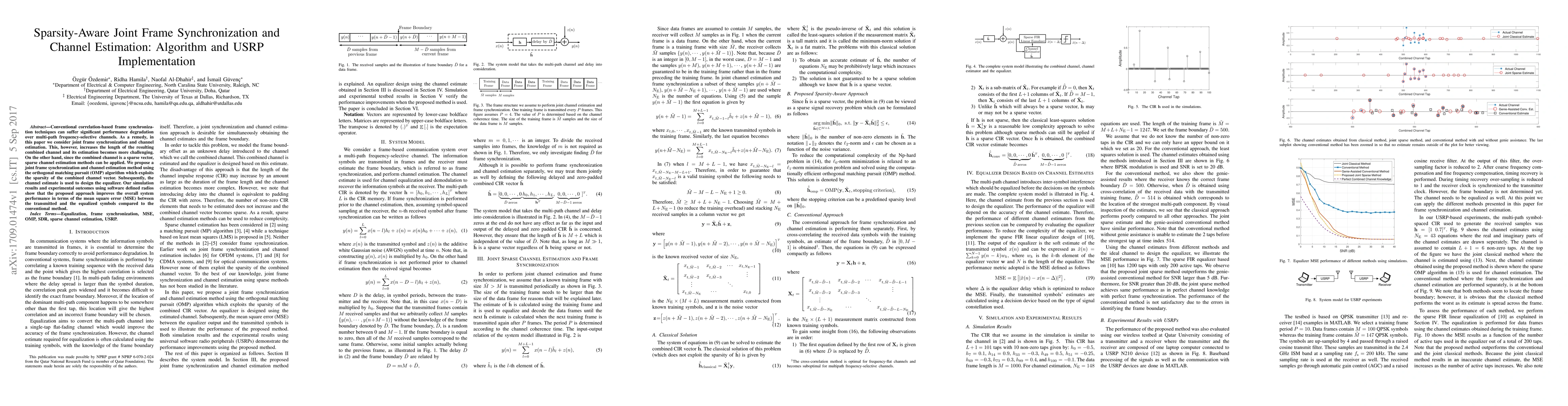 Conventional correlation-based frame synchronization techniques can suffer significant performance degradation over multi-path frequency-selective channels. As a remedy, in this paper we consider joint frame synchronization and channel estimation. This, however, increases the length of the resulting combined channel and its estimation becomes more challenging. On the other hand, since the combined channel is a sparse vector, sparse channel estimation methods can be applied. We propose a joint frame synchronization and channel estimation method using the orthogonal matching pursuit (OMP) algorithm which exploits the sparsity of the combined channel vector. Subsequently, the channel estimate is used to design the equalizer. Our simulation results and experimental outcomes using software defined radios show that the proposed approach improves the overall system performance in terms of the mean square error (MSE) between the transmitted and the equalized symbols compared to the conventional method.