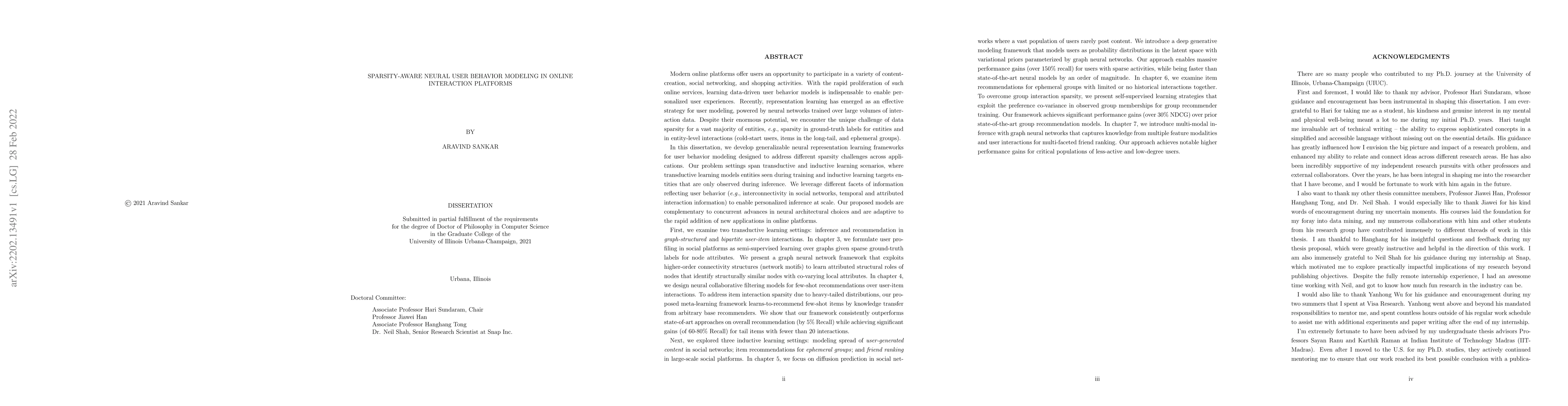 This paper develops neural representation learning frameworks to model user behavior in online interaction platforms, addressing the challenge of data sparsity through transductive and inductive learning scenarios. The proposed models leverage various user behavior information to enable personalized experiences at scale.