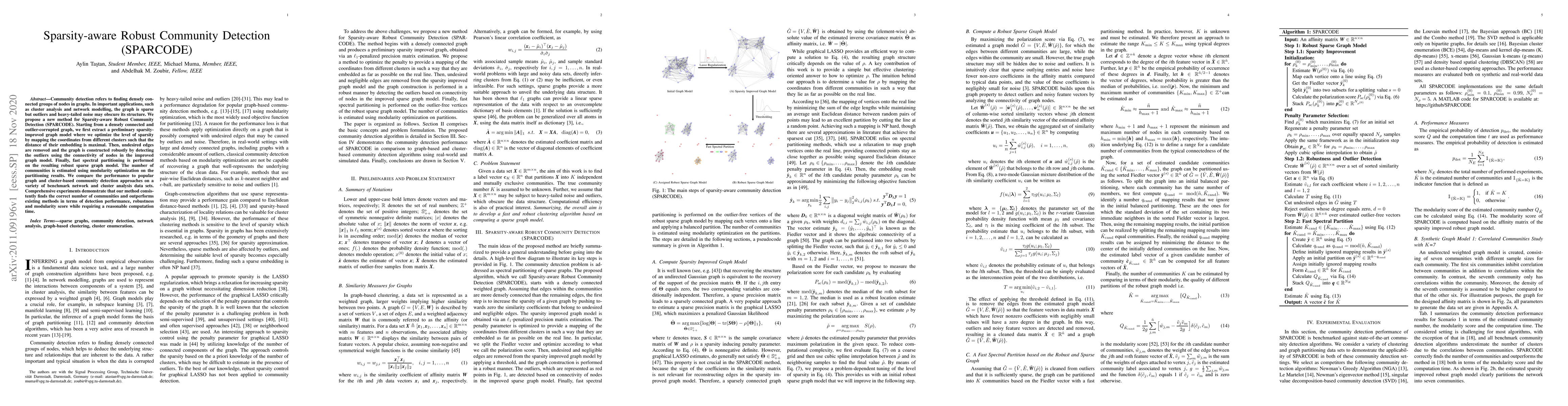 The SPARCODE method proposes a robust approach for community detection in sparse graphs affected by outliers and noise. It optimizes sparsity, removes undesired edges, and employs spectral partitioning to detect communities, outperforming existing methods in accuracy and robustness.