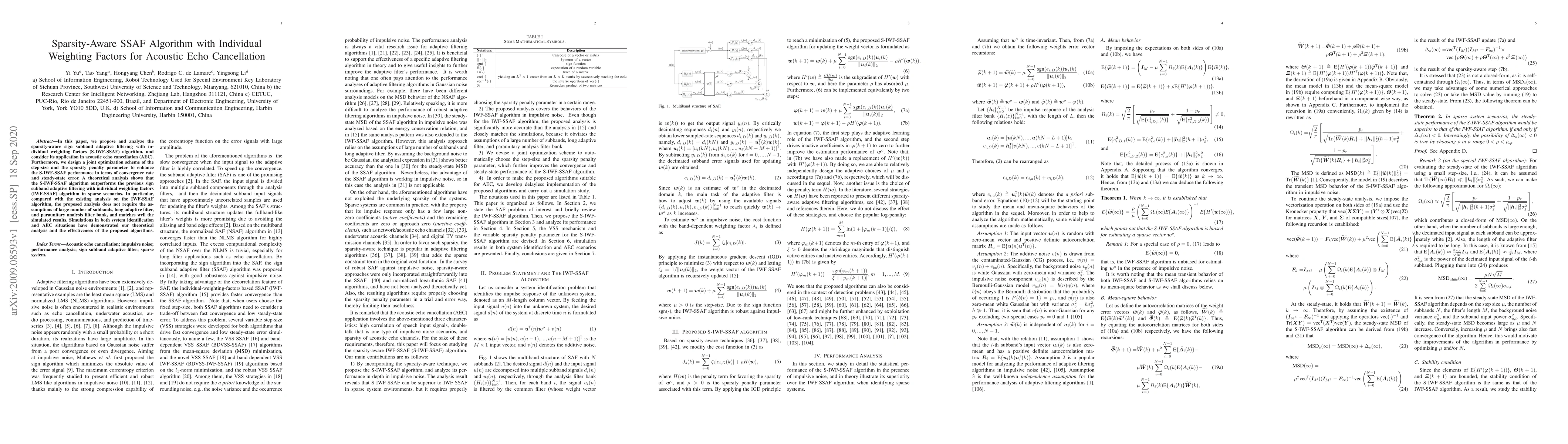 This paper introduces a sparsity-aware sign subband adaptive filtering algorithm with individual weighting factors (S-IWF-SSAF) for acoustic echo cancellation, optimizing step-size and sparsity penalty parameters for improved performance. Theoretical analysis and simulations show that S-IWF-SSAF outperforms the previous IWF-SSAF algorithm in sparse scenarios.