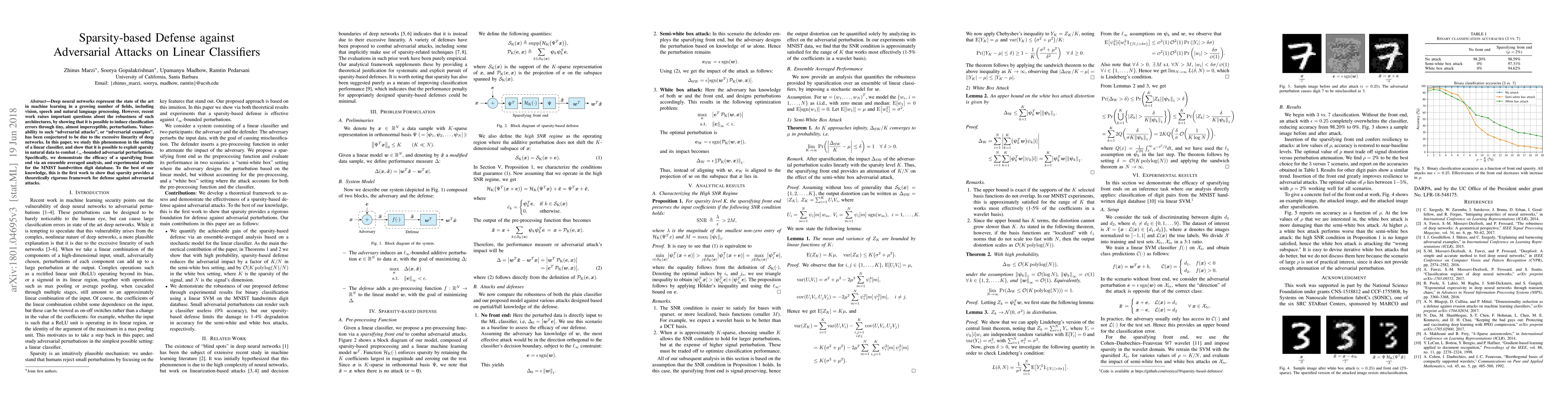 This paper investigates the vulnerability of linear classifiers to adversarial attacks and proposes a sparsifying front end as a defense mechanism. It demonstrates that exploiting sparsity in natural data can effectively mitigate $\ell_{\infty}$-bounded adversarial perturbations, supported by experimental results on the MNIST dataset.