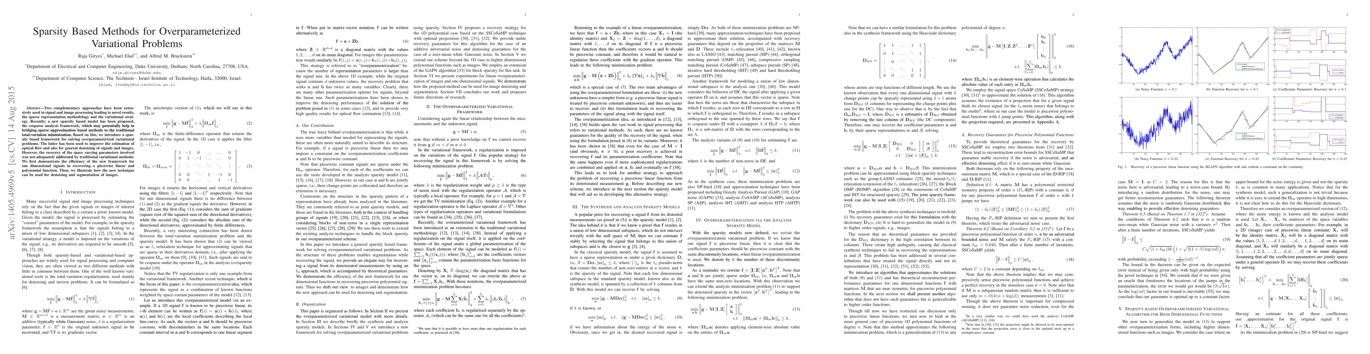 Two complementary approaches have been extensively used in signal and image processing leading to novel results, the sparse representation methodology and the variational strategy. Recently, a new sparsity based model has been proposed, the cosparse analysis framework, which may potentially help in bridging sparse approximation based methods to the traditional total-variation minimization. Based on this, we introduce a sparsity based framework for solving overparameterized variational problems. The latter has been used to improve the estimation of optical flow and also for general denoising of signals and images. However, the recovery of the space varying parameters involved was not adequately addressed by traditional variational methods. We first demonstrate the efficiency of the new framework for one dimensional signals in recovering a piecewise linear and polynomial function. Then, we illustrate how the new technique can be used for denoising and segmentation of images.