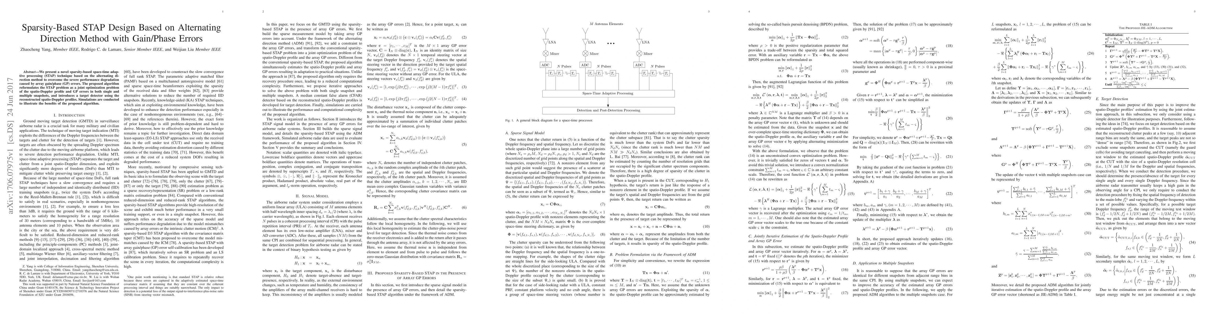 We present a novel sparsity-based space-time adaptive processing (STAP) technique based on the alternating direction method to overcome the severe performance degradation caused by array gain/phase (GP) errors. The proposed algorithm reformulates the STAP problem as a joint optimization problem of the spatio-Doppler profile and GP errors in both single and multiple snapshots, and introduces a target detector using the reconstructed spatio-Doppler profiles. Simulations are conducted to illustrate the benefits of the proposed algorithm.
