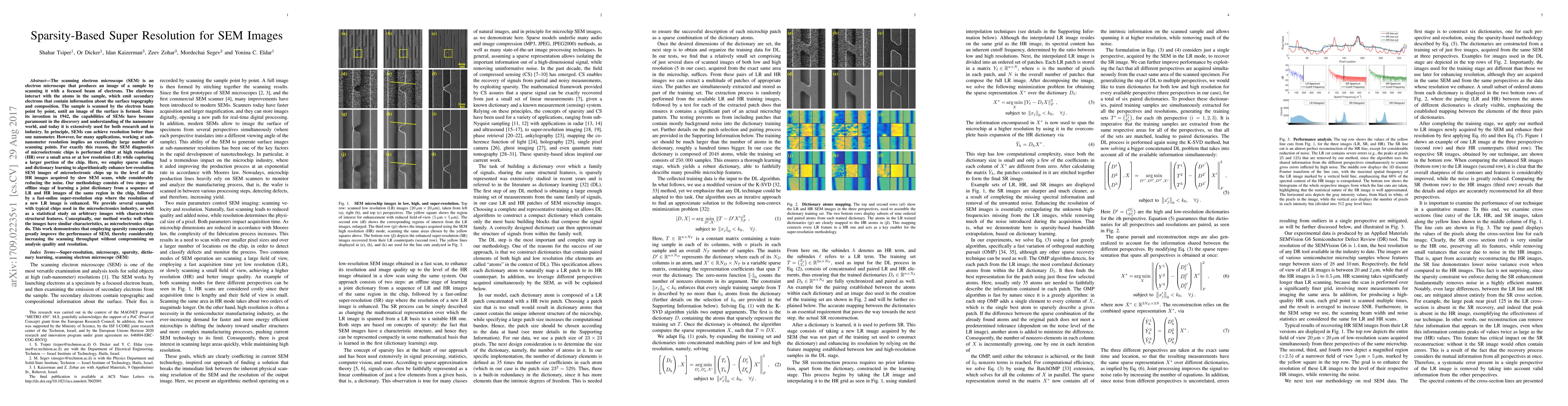 This paper proposes a sparsity-based super resolution technique to enhance low-resolution SEM images of microelectronic chips to high-resolution levels, using sparse coding and dictionary learning. The method involves learning a joint dictionary offline from paired low and high-resolution images, followed by a fast online enhancement of new low-resolution images.