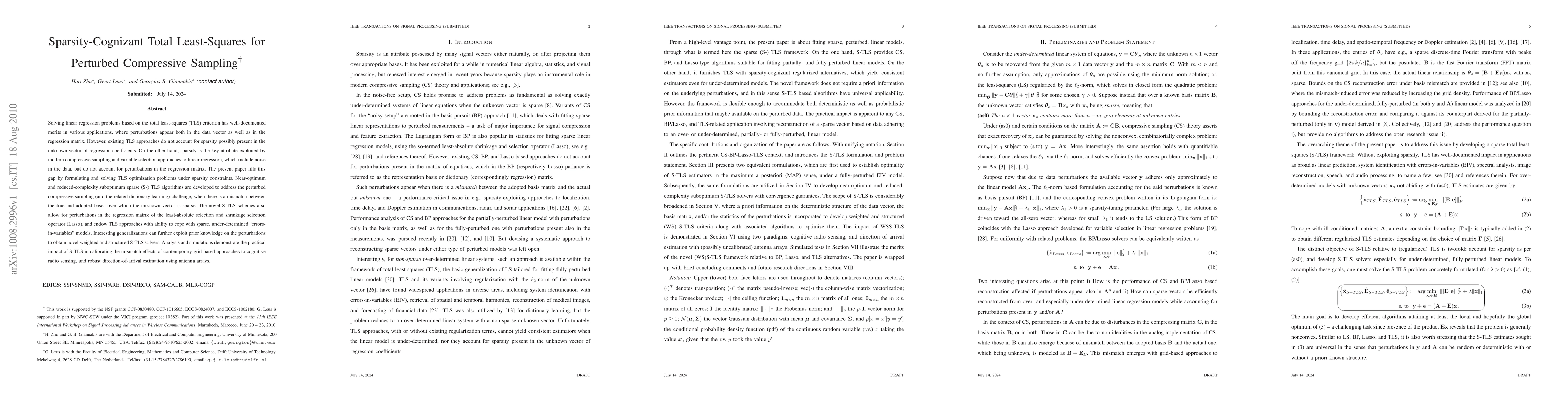 This paper proposes sparsity-cognizant total least-squares (S-TLS) algorithms to address perturbed compressive sampling problems, integrating sparsity constraints into TLS optimization to handle errors in both data and regression matrices. The developed S-TLS schemes enable robust solutions for "errors-in-variables" models and demonstrate practical applications in cognitive radio sensing and direction-of-arrival estimation.