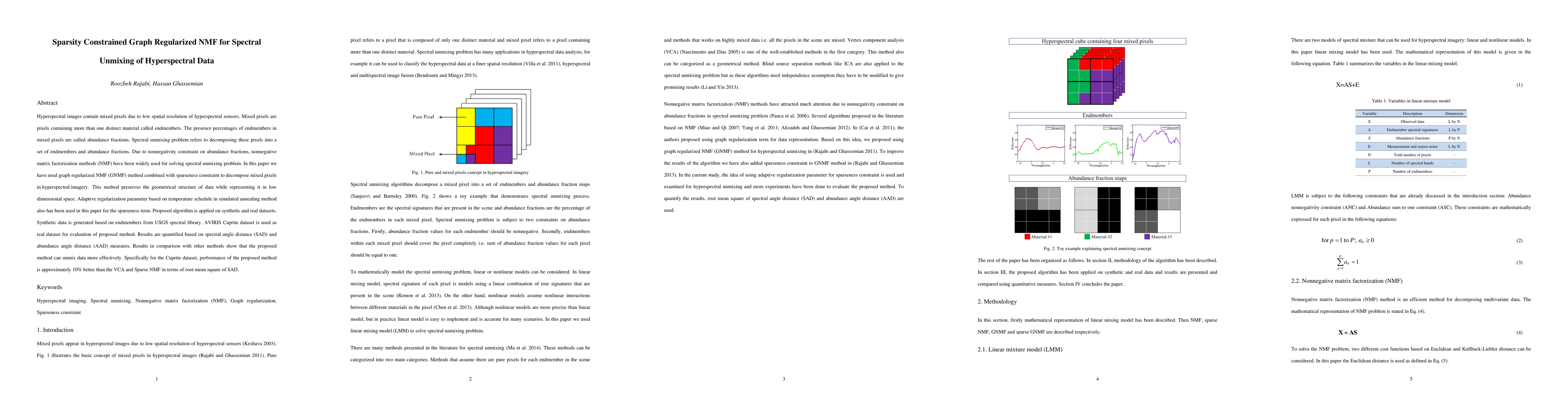 This paper proposes a sparsity-constrained graph regularized nonnegative matrix factorization (GNMF) method for spectral unmixing in hyperspectral imagery, achieving better performance than other methods by preserving data structure and using an adaptive regularization parameter. The method is evaluated on synthetic and real datasets, showing approximately 10% improvement in unmixing accuracy for the Cuprite dataset compared to VCA and Sparse NMF.