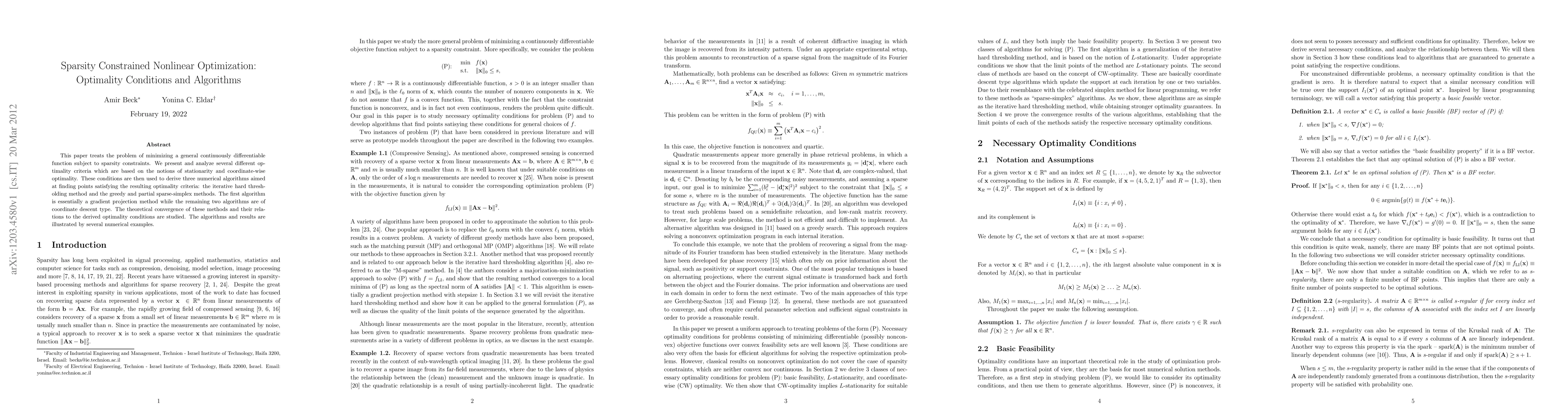 Researchers developed algorithms for minimizing functions with sparsity constraints, focusing on optimality conditions and convergence, with applications in various fields like signal processing and machine learning.