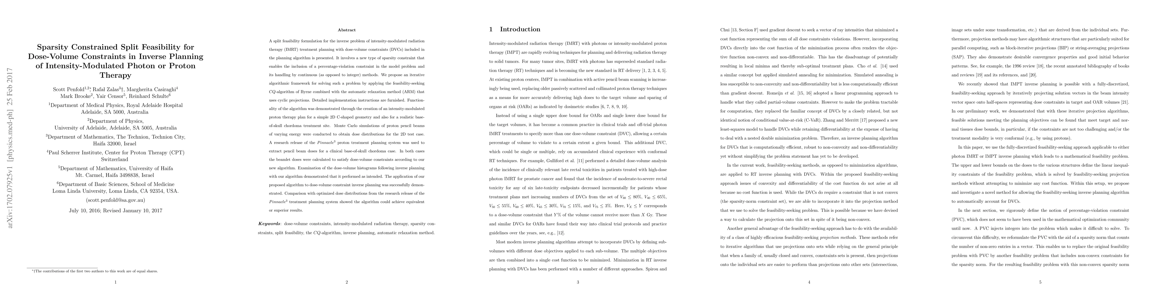 A split feasibility formulation for the inverse problem of intensity-modulated radiation therapy (IMRT) treatment planning with dose-volume constraints (DVCs) included in the planning algorithm is presented. It involves a new type of sparsity constraint that enables the inclusion of a percentage-violation constraint in the model problem and its handling by continuous (as opposed to integer) methods. We propose an iterative algorithmic framework for solving such a problem by applying the feasibility-seeking CQ-algorithm of Byrne combined with the automatic relaxation method (ARM) that uses cyclic projections. Detailed implementation instructions are furnished. Functionality of the algorithm was demonstrated through the creation of an intensity-modulated proton therapy plan for a simple 2D C-shaped geometry and also for a realistic base-of-skull chordoma treatment site. Monte Carlo simulations of proton pencil beams of varying energy were conducted to obtain dose distributions for the 2D test case. A research release of the Pinnacle3 proton treatment planning system was used to extract pencil beam doses for a clinical base-of-skull chordoma case. In both cases the beamlet doses were calculated to satisfy dose-volume constraints according to our new algorithm. Examination of the dose-volume histograms following inverse planning with our algorithm demonstrated that it performed as intended. The application of our proposed algorithm to dose-volume constraint inverse planning was successfully demonstrated. Comparison with optimized dose distributions from the research release of the Pinnacle3 treatment planning system showed the algorithm could achieve equivalent or superior results.