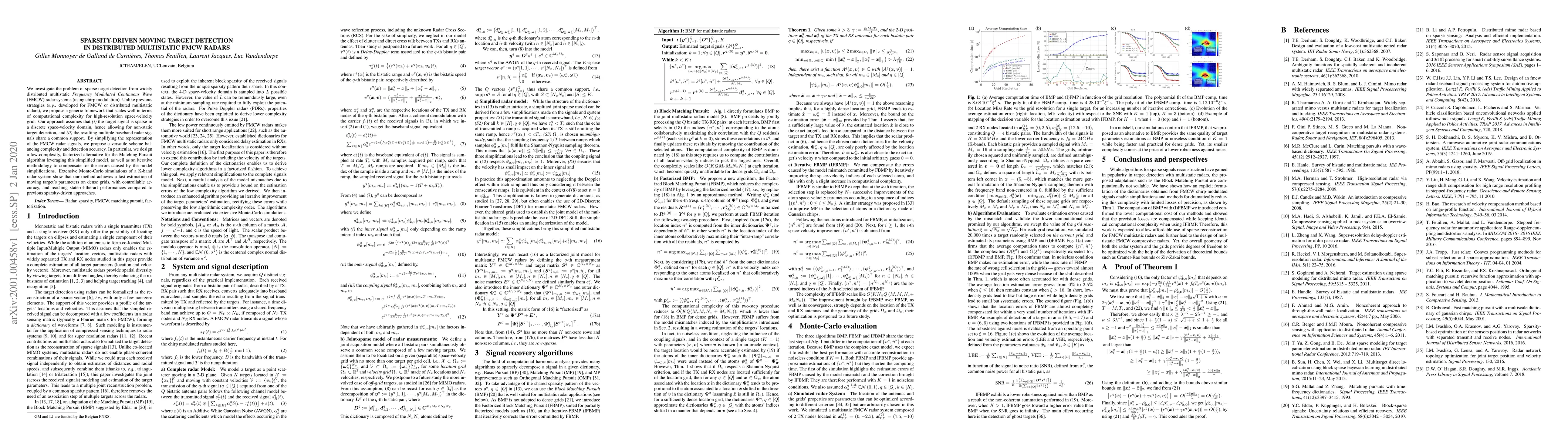 This paper proposes a novel framework for sparse target detection in distributed multistatic FMCW radar systems, focusing on computational efficiency and high-resolution space-velocity grids. The method leverages the sparsity of target signals and a simplified radar signal model to achieve fast and accurate moving target parameter estimation, outperforming previous approaches.