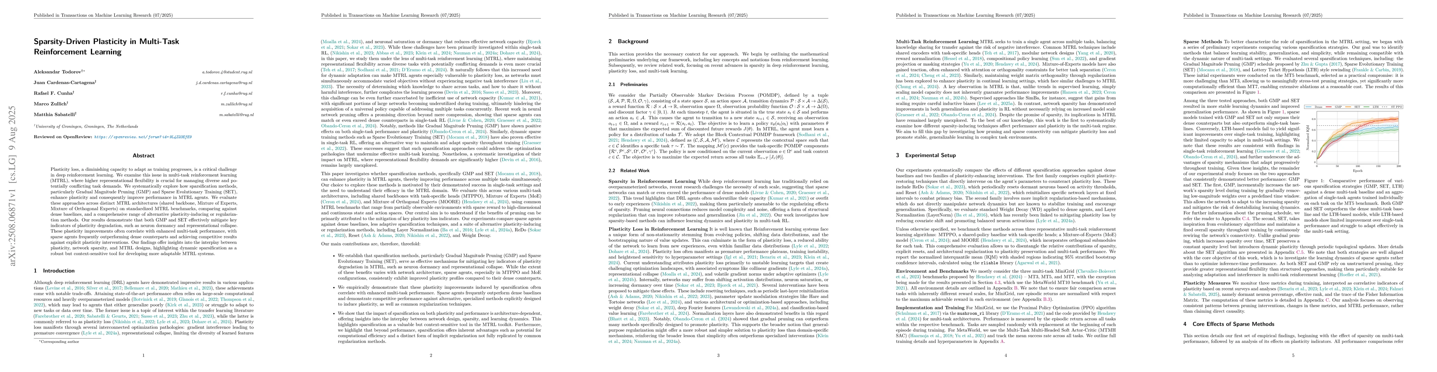 This study systematically explores the impact of sparsification methods, specifically Gradual Magnitude Pruning (GMP) and Sparse Evolutionary Training (SET), on plasticity and performance in Multi-Task Reinforcement Learning (MTRL) agents. The research evaluates these approaches across various MTRL architectures and benchmarks, comparing them against dense baselines and alternative plasticity-inducing methods.