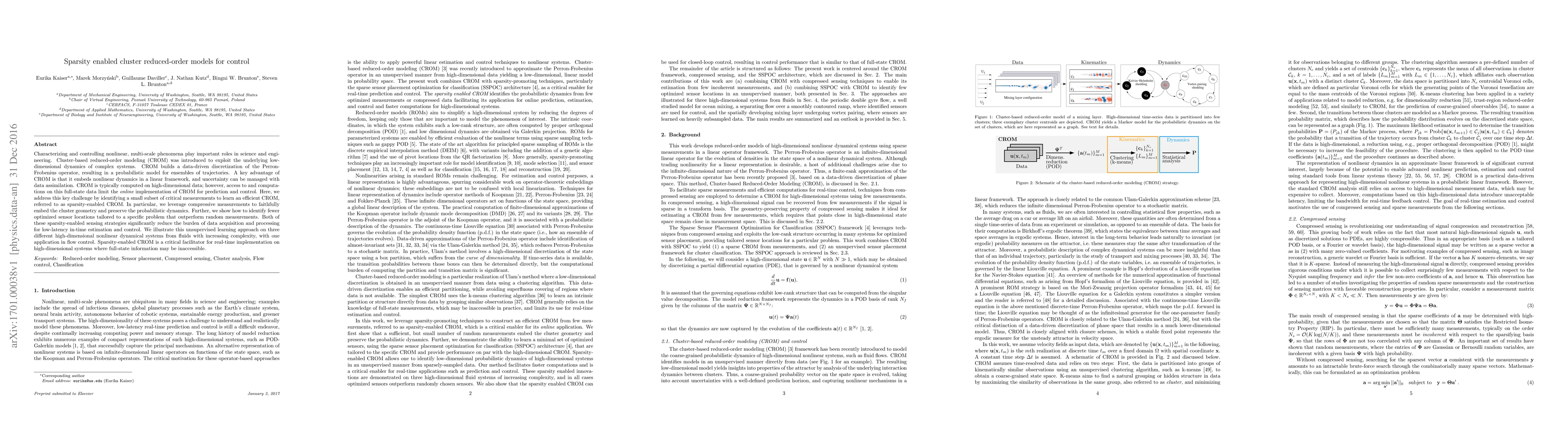 Characterizing and controlling nonlinear, multi-scale phenomena play important roles in science and engineering. Cluster-based reduced-order modeling (CROM) was introduced to exploit the underlying low-dimensional dynamics of complex systems. CROM builds a data-driven discretization of the Perron-Frobenius operator, resulting in a probabilistic model for ensembles of trajectories. A key advantage of CROM is that it embeds nonlinear dynamics in a linear framework, and uncertainty can be managed with data assimilation. CROM is typically computed on high-dimensional data, however, access to and computations on this full-state data limit the online implementation of CROM for prediction and control. Here, we address this key challenge by identifying a small subset of critical measurements to learn an efficient CROM, referred to as sparsity-enabled CROM. In particular, we leverage compressive measurements to faithfully embed the cluster geometry and preserve the probabilistic dynamics. Further, we show how to identify fewer optimized sensor locations tailored to a specific problem that outperform random measurements. Both of these sparsity-enabled sensing strategies significantly reduce the burden of data acquisition and processing for low-latency in-time estimation and control. We illustrate this unsupervised learning approach on three different high-dimensional nonlinear dynamical systems from fluids with increasing complexity, with one application in flow control. Sparsity-enabled CROM is a critical facilitator for real-time implementation on high-dimensional systems where full-state information may be inaccessible.