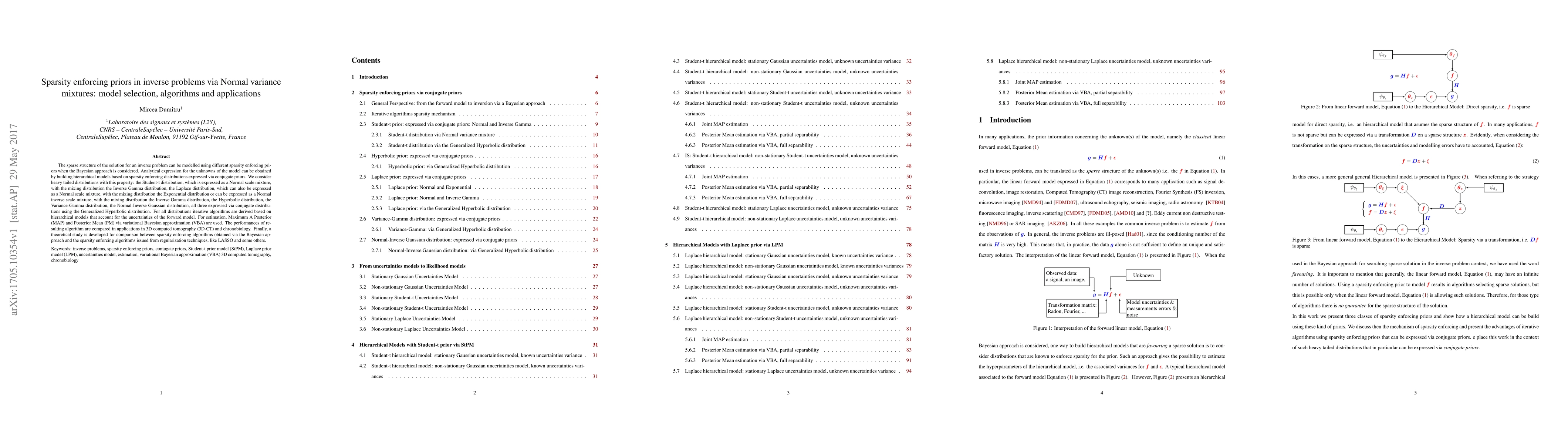 This paper explores the use of sparsity enforcing priors in inverse problems through normal variance mixtures, focusing on heavy-tailed distributions like the Student-t and Laplace distributions. It develops iterative algorithms based on hierarchical models and compares their performance in applications such as 3D-CT and chronobiology, also theoretically comparing Bayesian and regularization-based sparsity methods.