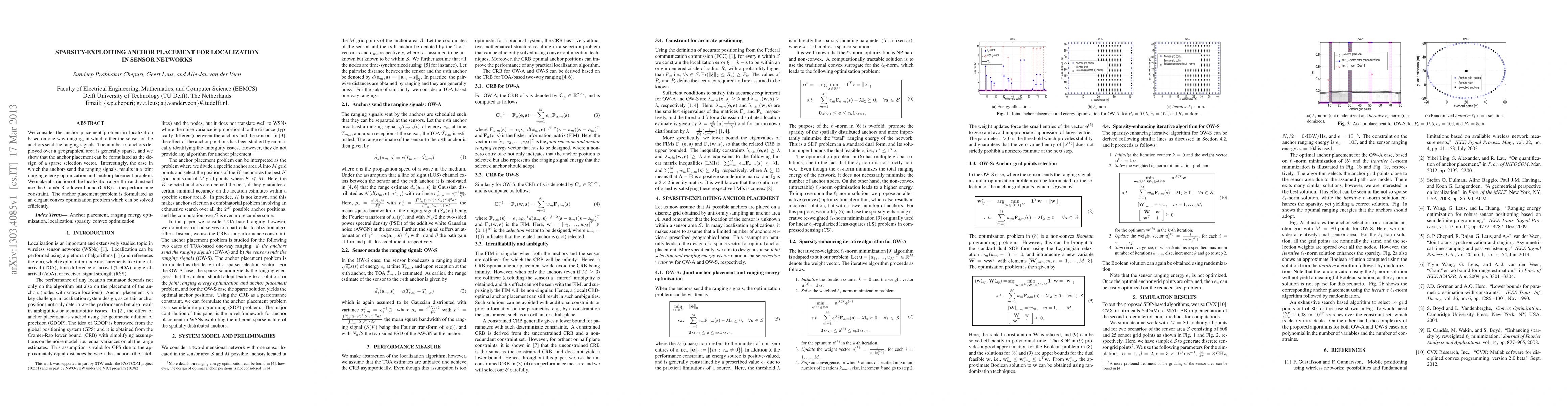 This paper addresses the sparse anchor placement problem in sensor network localization using one-way ranging, formulating it as a convex optimization problem to optimize anchor placement and ranging energy. The approach uses the Cramér-Rao lower bound as a performance constraint for efficient solution.