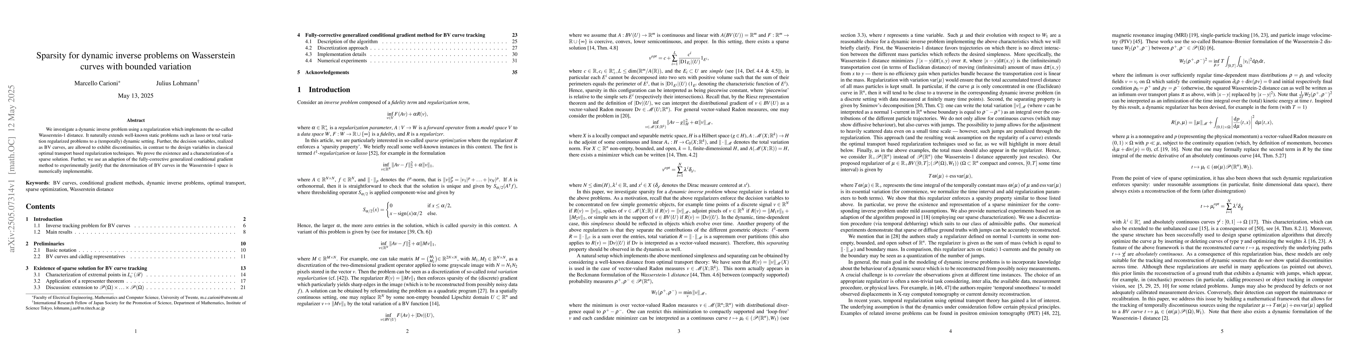 The paper presents a novel regularization method for dynamic inverse problems using Wasserstein-$1$ distance, along with a sparse solution characterization and a numerically implementable algorithm.
