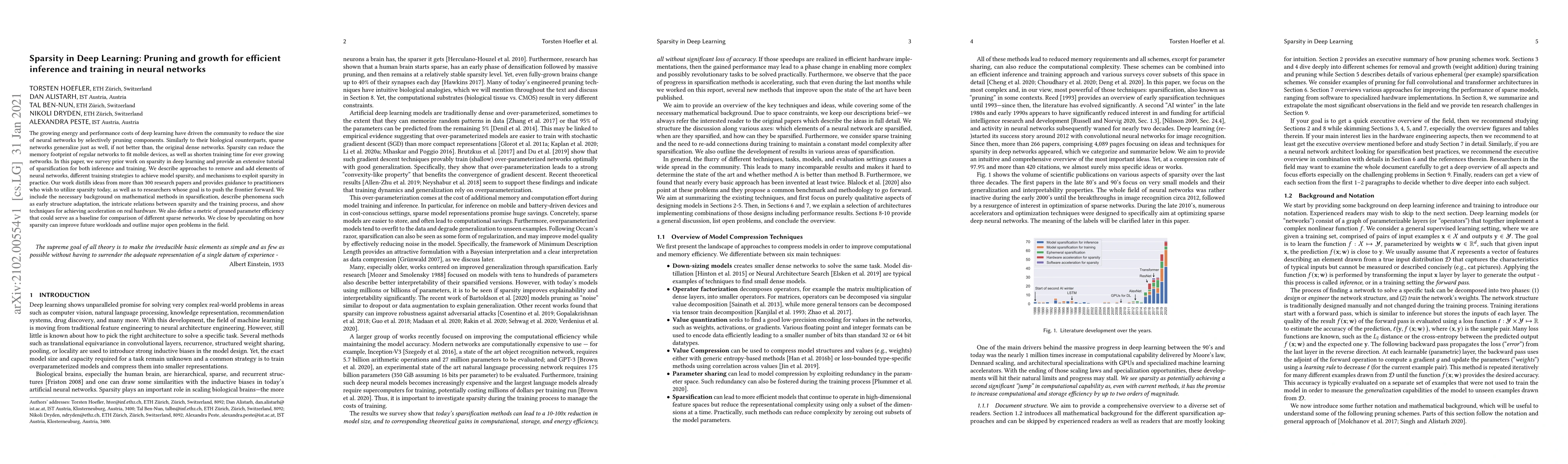 The growing energy and performance costs of deep learning have driven the community to reduce the size of neural networks by selectively pruning components. Similarly to their biological counterparts, sparse networks generalize just as well, if not better than, the original dense networks. Sparsity can reduce the memory footprint of regular networks to fit mobile devices, as well as shorten training time for ever growing networks. In this paper, we survey prior work on sparsity in deep learning and provide an extensive tutorial of sparsification for both inference and training. We describe approaches to remove and add elements of neural networks, different training strategies to achieve model sparsity, and mechanisms to exploit sparsity in practice. Our work distills ideas from more than 300 research papers and provides guidance to practitioners who wish to utilize sparsity today, as well as to researchers whose goal is to push the frontier forward. We include the necessary background on mathematical methods in sparsification, describe phenomena such as early structure adaptation, the intricate relations between sparsity and the training process, and show techniques for achieving acceleration on real hardware. We also define a metric of pruned parameter efficiency that could serve as a baseline for comparison of different sparse networks. We close by speculating on how sparsity can improve future workloads and outline major open problems in the field.