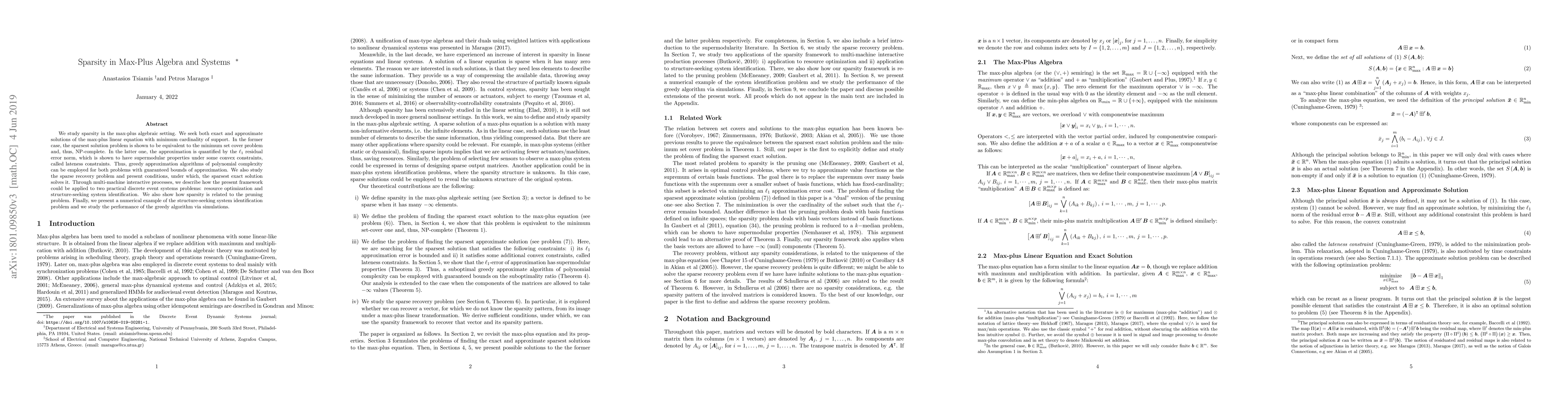 This paper investigates sparsity in max-plus algebra and systems, showing that solving for sparse solutions can be reduced to the minimum set cover problem and a variant of the approximation algorithm for the $ extit{l}_{1}$ residual error norm. The results have implications for resource optimization and system identification problems.