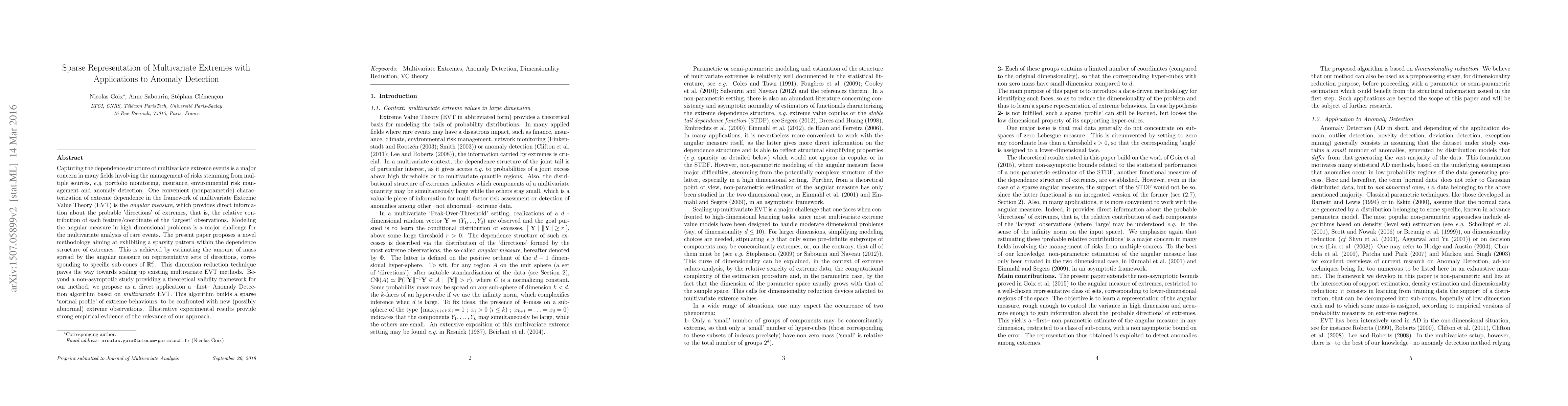 Capturing the dependence structure of multivariate extreme events is a major concern in many fields involving the management of risks stemming from multiple sources, e.g. portfolio monitoring, insurance, environmental risk management and anomaly detection. One convenient (non-parametric) characterization of extremal dependence in the framework of multivariate Extreme Value Theory (EVT) is the angular measure, which provides direct information about the probable 'directions' of extremes, that is, the relative contribution of each feature/coordinate of the 'largest' observations. Modeling the angular measure in high dimensional problems is a major challenge for the multivariate analysis of rare events. The present paper proposes a novel methodology aiming at exhibiting a sparsity pattern within the dependence structure of extremes. This is done by estimating the amount of mass spread by the angular measure on representative sets of directions, corresponding to specific sub-cones of $R^d\_+$. This dimension reduction technique paves the way towards scaling up existing multivariate EVT methods. Beyond a non-asymptotic study providing a theoretical validity framework for our method, we propose as a direct application a --first-- anomaly detection algorithm based on multivariate EVT. This algorithm builds a sparse 'normal profile' of extreme behaviours, to be confronted with new (possibly abnormal) extreme observations. Illustrative experimental results provide strong empirical evidence of the relevance of our approach.