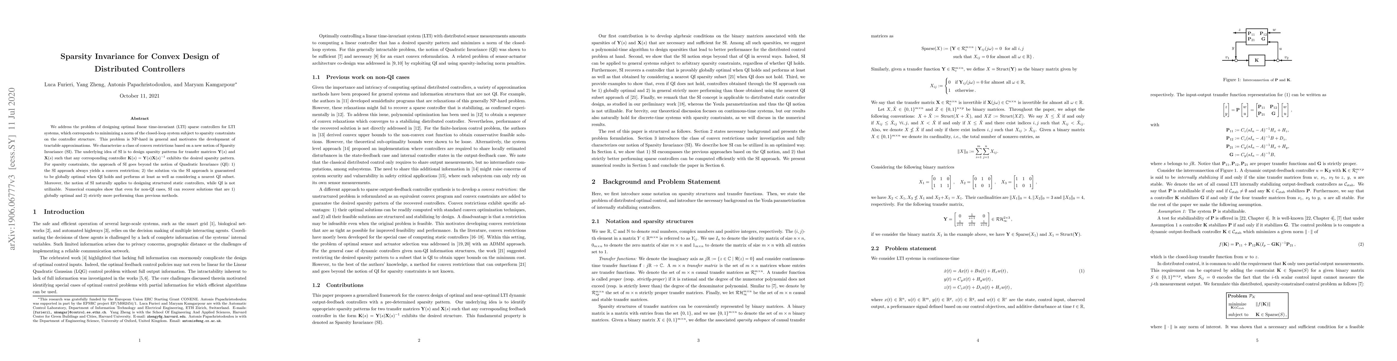 This paper develops a convex design method for sparse distributed controllers based on Sparsity Invariance (SI), which guarantees global optimality and better performance compared to Quadratic Invariance (QI) approaches, especially for non-QI cases. SI ensures convex restrictions and optimal solutions while naturally extending to structured static controllers.