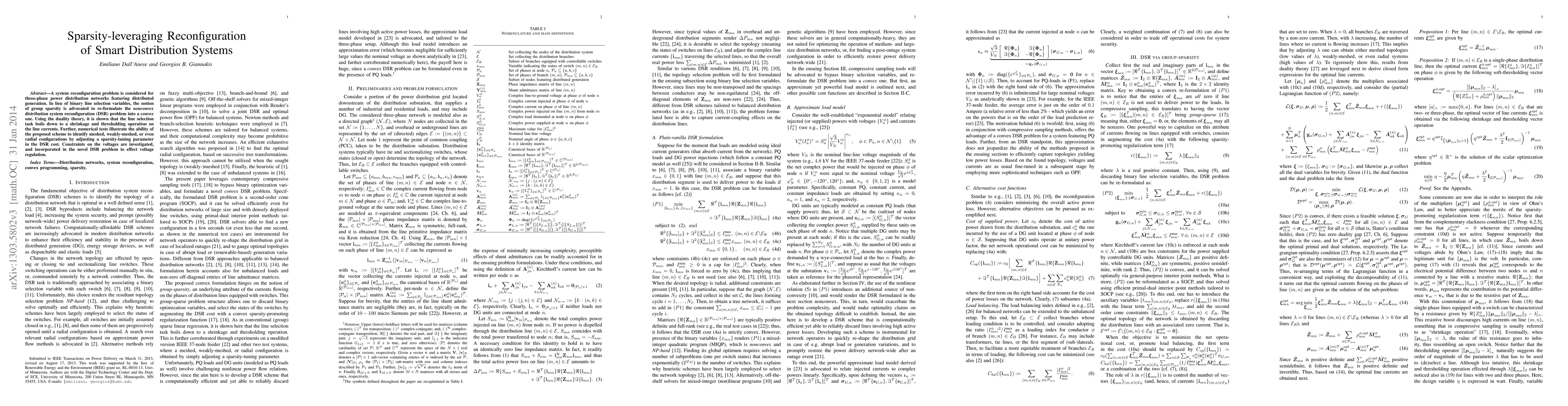 A system reconfiguration problem is considered for three-phase power distribution networks featuring distributed generation. In lieu of binary line selection variables, the notion of group sparsity is advocated to re-formulate the nonconvex distribution system reconfiguration (DSR) problem into a convex one. Using the duality theory, it is shown that the line selection task boils down to a shrinkage and thresholding operation on the line currents. Further, numerical tests illustrate the ability of the proposed scheme to identify meshed, weakly-meshed, or even radial configurations by adjusting a sparsity-tuning parameter in the DSR cost. Constraints on the voltages are investigated, and incorporated in the novel DSR problem to effect voltage regulation.