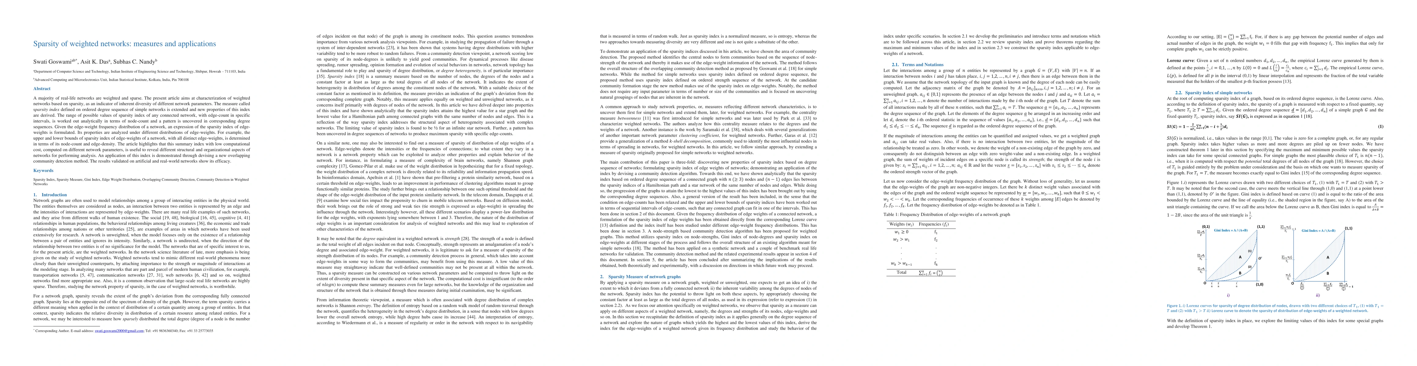 A majority of real life networks are weighted and sparse. The present article aims at characterization of weighted networks based on sparsity, as a measure of inherent diversity, of different network parameters. It utilizes sparsity index defined on ordered degree sequence of simple networks and derives further properties of this index. The range of possible values of sparsity index of any connected network, with edge-count in specific intervals, is worked out analytically in terms of node-count; a pattern is uncovered in corresponding degree sequences to produce highest sparsities. Given the edge-weight frequency distribution of a network, we have formulated an expression of the sparsity index of edge-weights. Its properties are analyzed under different distributions of edge-weights. For example, the upper and lower bounds of sparsity index of edge-weights of a network, having all distinct edge-weights, is determined in terms of its node-count and edge density. The article highlights that this summary index with low computational cost, computed on different network parameters, is useful to reveal different structural and organizational aspects of networks for performing analysis. An application of this index has been demonstrated through overlapping community detection of networks. The results validated on artificial and real-world networks show its efficacy.