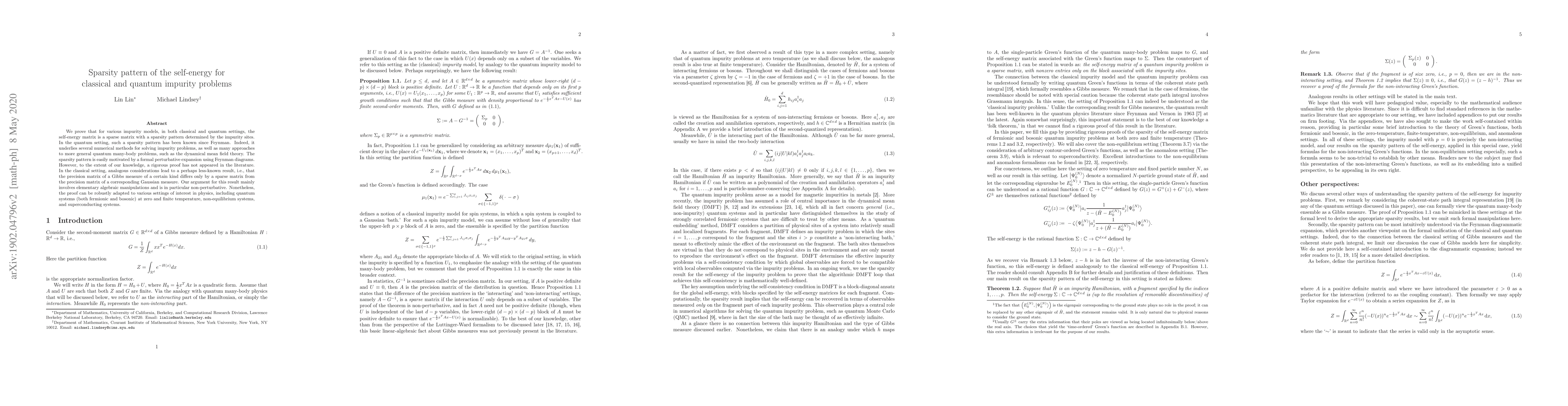 We prove that for various impurity models, in both classical and quantum settings, the self-energy matrix is a sparse matrix with a sparsity pattern determined by the impurity sites. In the quantum setting, such a sparsity pattern has been known since Feynman. Indeed, it underlies several numerical methods for solving impurity problems, as well as many approaches to more general quantum many-body problems, such as the dynamical mean field theory. The sparsity pattern is easily motivated by a formal perturbative expansion using Feynman diagrams. However, to the extent of our knowledge, a rigorous proof has not appeared in the literature. In the classical setting, analogous considerations lead to a perhaps less-known result, i.e., that the precision matrix of a Gibbs measure of a certain kind differs only by a sparse matrix from the precision matrix of a corresponding Gaussian measure. Our argument for this result mainly involves elementary algebraic manipulations and is in particular non-perturbative. Nonetheless, the proof can be robustly adapted to various settings of interest in physics, including quantum systems (both fermionic and bosonic) at zero and finite temperature, non-equilibrium systems, and superconducting systems.